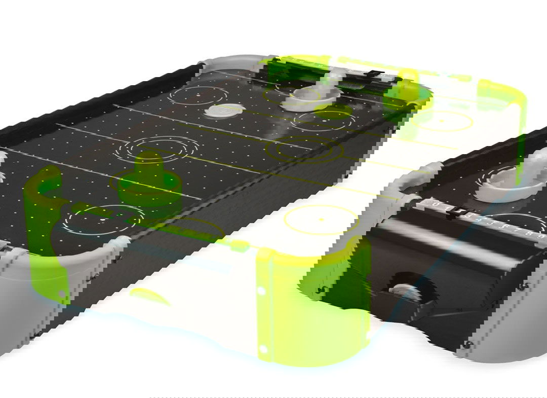 Masa air hockey cu elemente neon.
