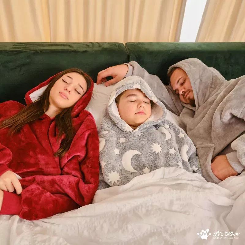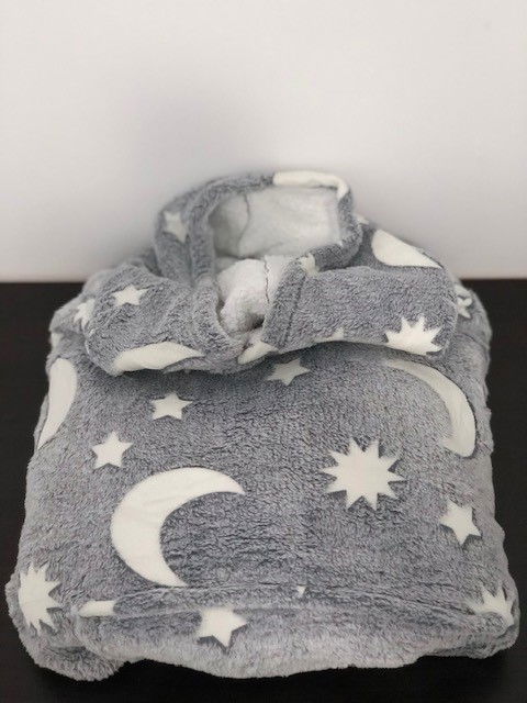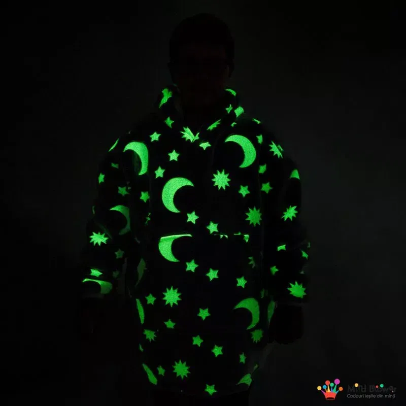 Hanorac patura cu maneci baieti Grey Luna Fosforescenta cu buzunar cangur, Flanel & Polar, 440gmp, 105 cm, il ajuta pe micul explorator de desene animate sau jocuri pe calculator ce este confortul chiar si in toiul celor mai friguroase ierni.