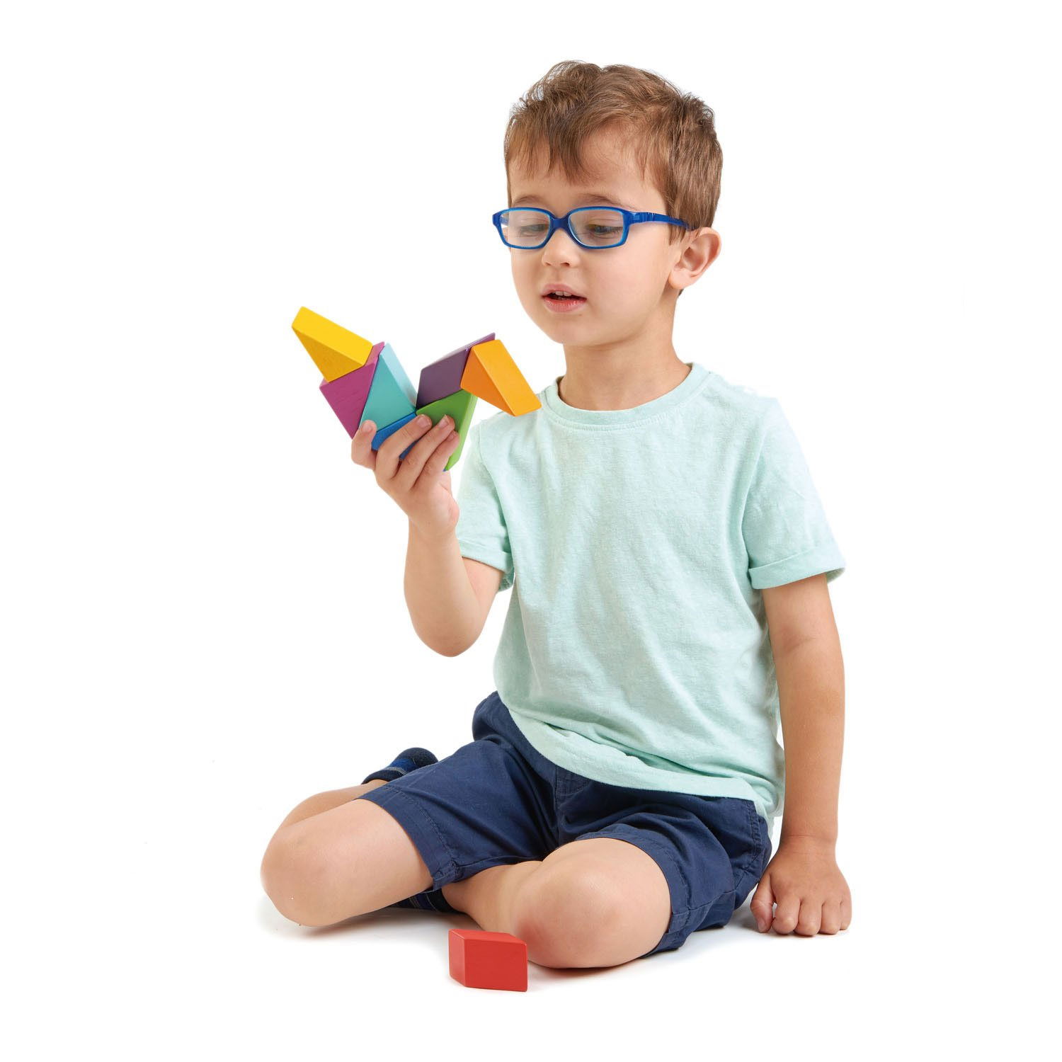 Joc de construit magnetic, din lemn premium - Designer Magblocs - 8 piese 8 piese magnetice în culori calde și reci, confecționate din lemn masiv și magneți multidirecționali ascunși. Include un săcuțel pentru depozitare.