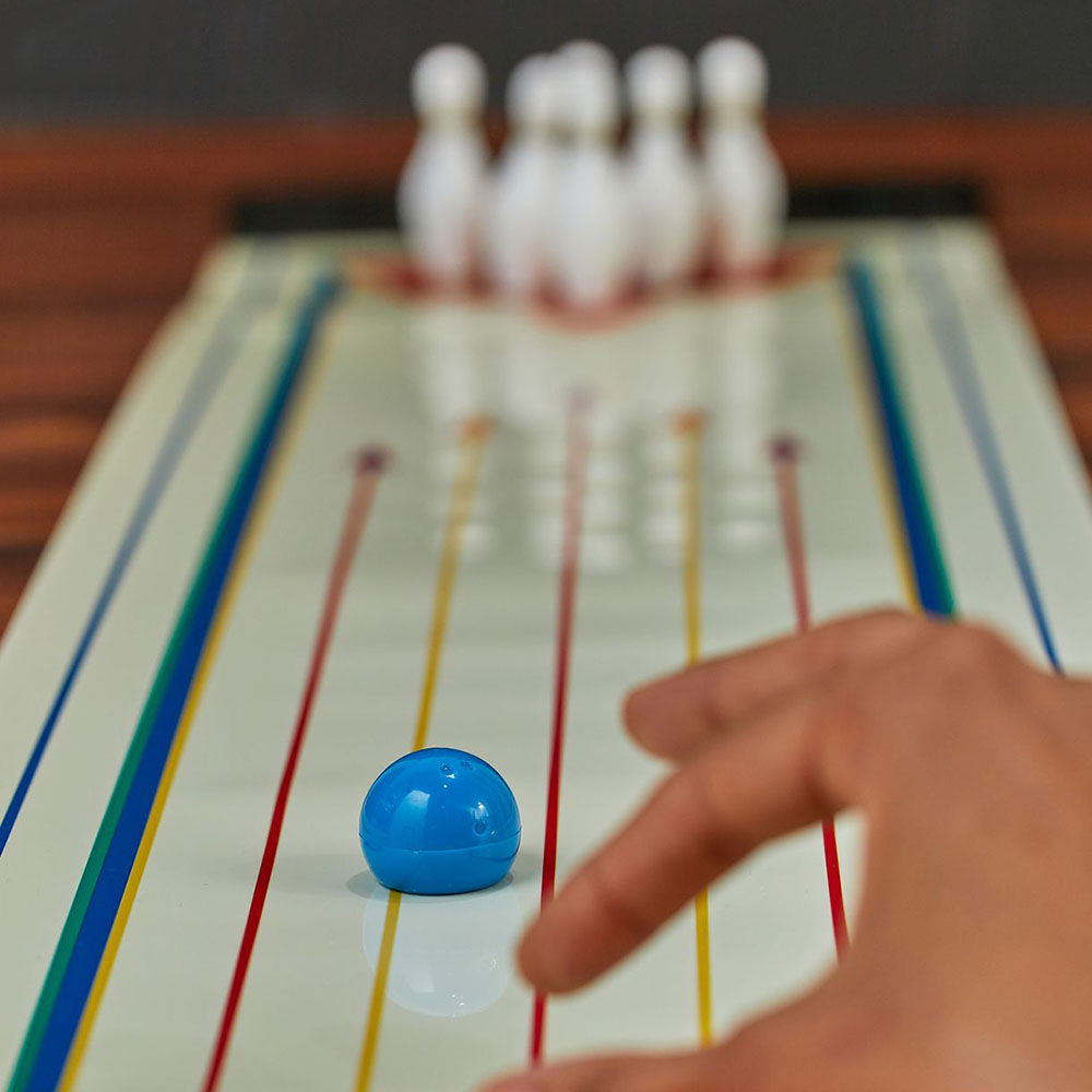 Se joaca in minim 2. Aseaza popicele pe inelele marcate, in format triunghi. Fiecare jucator arunca bila in trei reprize, de doua ori pe repriza. Arunca bila pe pista, spre popice, iar fiecare popica ce cade contorizeaza 1 punct. Daca reusesti sa rastorni toate cele 6 popice dintr-o lovitura, primesti 10 puncte. Cel care aduna cele mai multe puncte este declarat castigator.