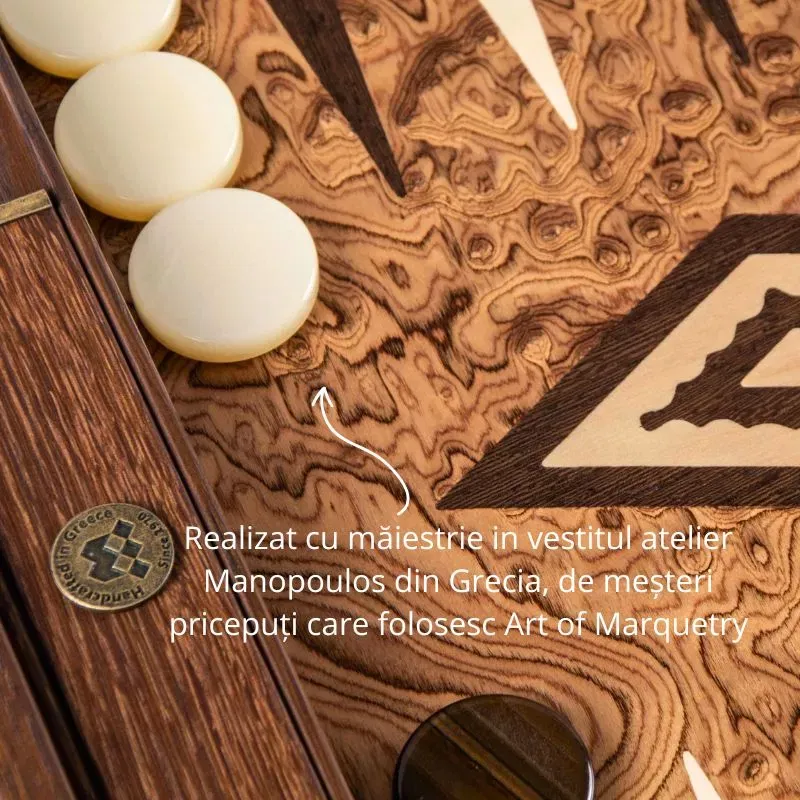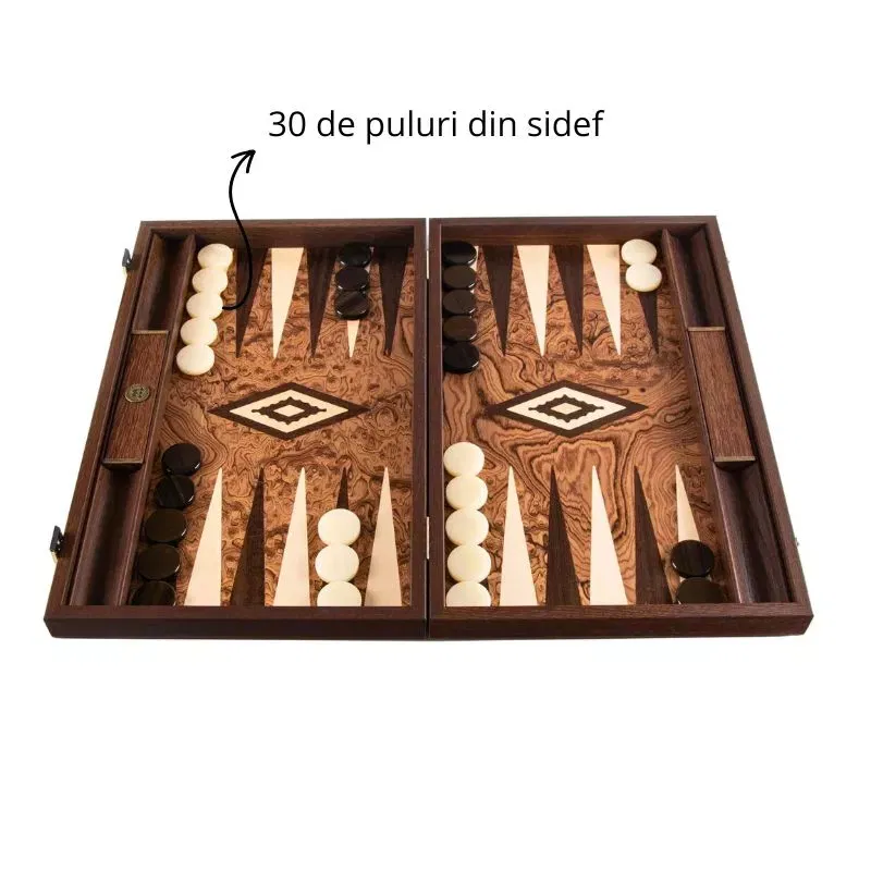 Jocul acesta de table confectionat din lemn de nuc, cu suporturi laterale pentru dame, este lucrat manual, atentia la detalii fiind o componenta esentiala a procesului de fabricatie.
