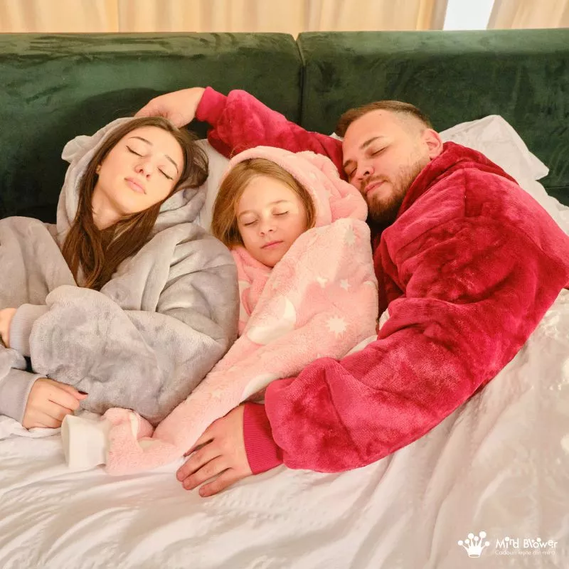 Imaginati-va o seara petrecuta impreuna, cu fiecare membru al familiei infasurat in aceste paturi cu maneci, povestind sau savurand ciocolata calda.