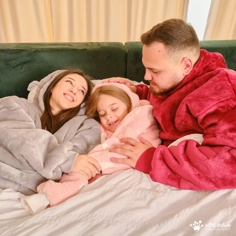 Fiecare hanorac patura cu maneci aduce o nota distincta de stil si afectiune, oferind o experienta unica de conectare pentru intreaga familie.