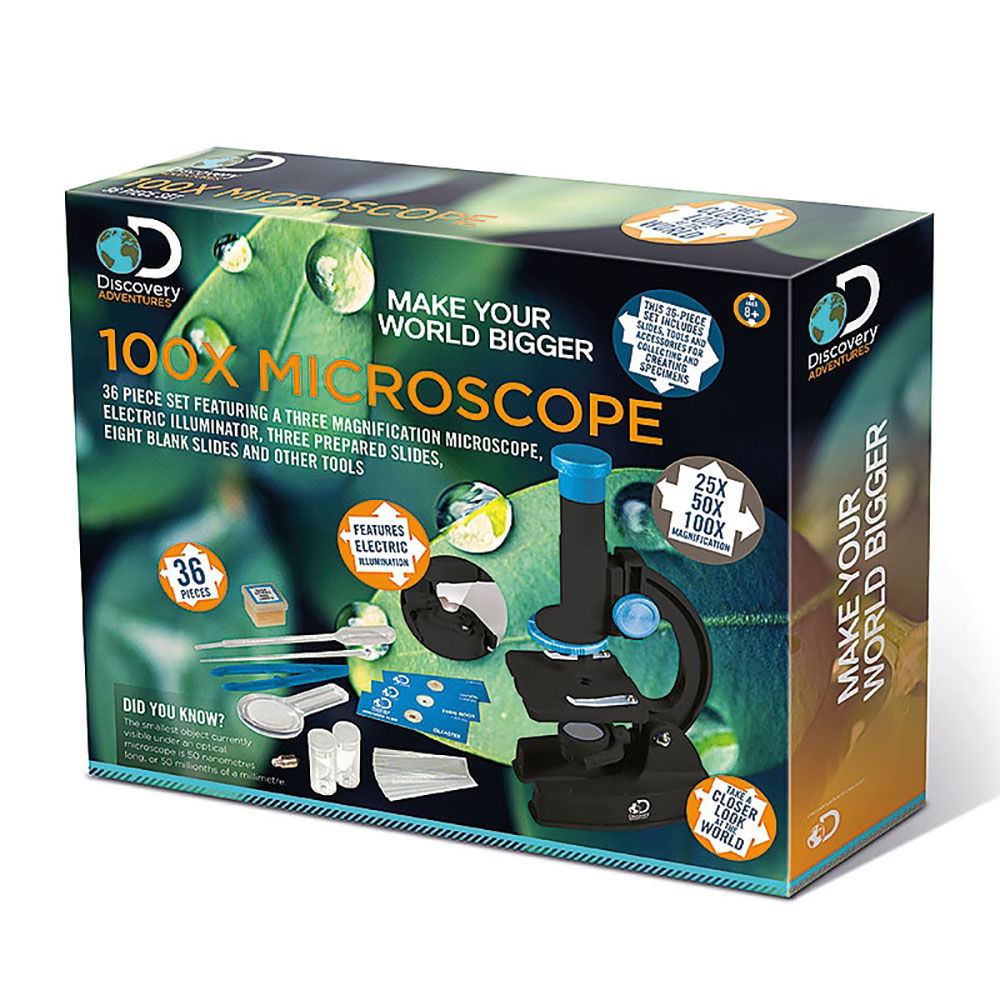Te simti ca un adevarat om de stiinta? Iti place sa analizezi cele mai minuscule particule care ar putea indica o viata fara batranete sau un prezent plin de mistere? Atunci ia-ti halatul si hai cu noi in cel mai mare laborator de stiinta. Noi facem cinste cu Discovery Adventure Microscop 100x, o unealta de nelipsit din necesarul unui adevarat om de stiinta.