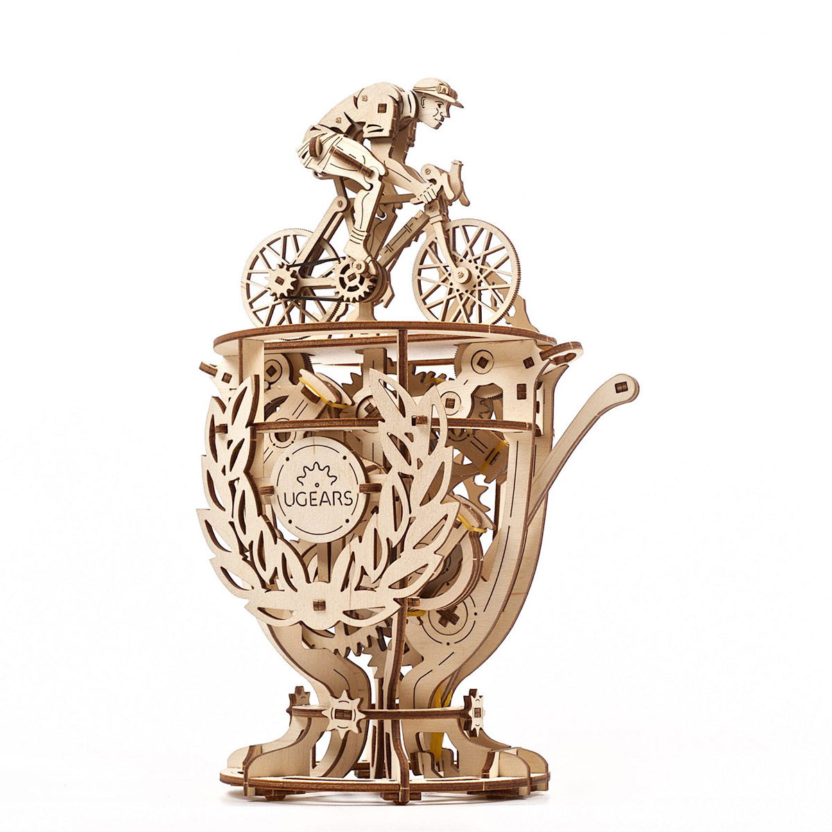 Utilizare: Dupa asamblare, activeaza maneta pe partea laterala si vezi cum ciclistul porneste in cursa. Cum e posibil acest lucru? Roata volanta care propulseaza modelul acumuleaza energie cinetica datorita greutatii. Exista si un slot special pe model, un locas in care poti pune o moneda sau un surub ca sa amplifici greutatea si sa schimbi impulsul mecanismului. Un cadou ideal pentru barbati pasionat de mecanica, ciclism, competitie si succes.