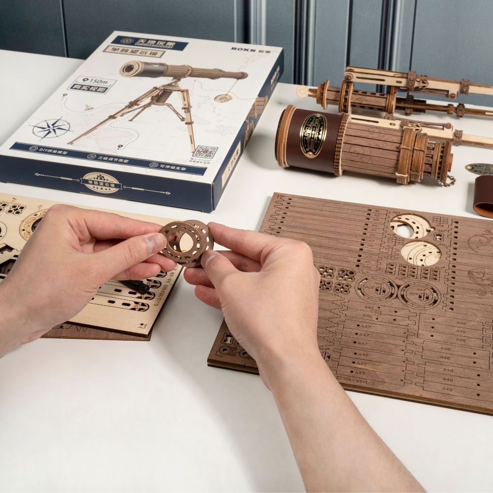 Cele 314 piese din lemn din care este compus acest telescop monocular, sunt taiate cu precizie la laser.