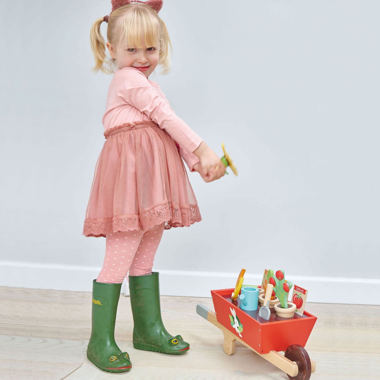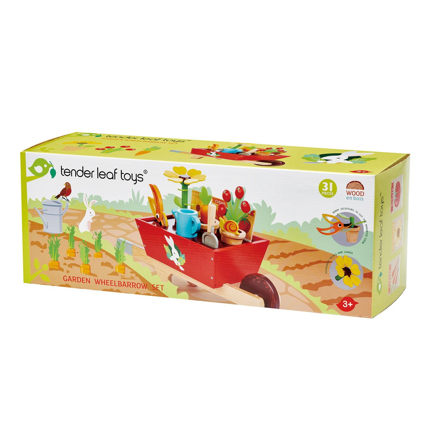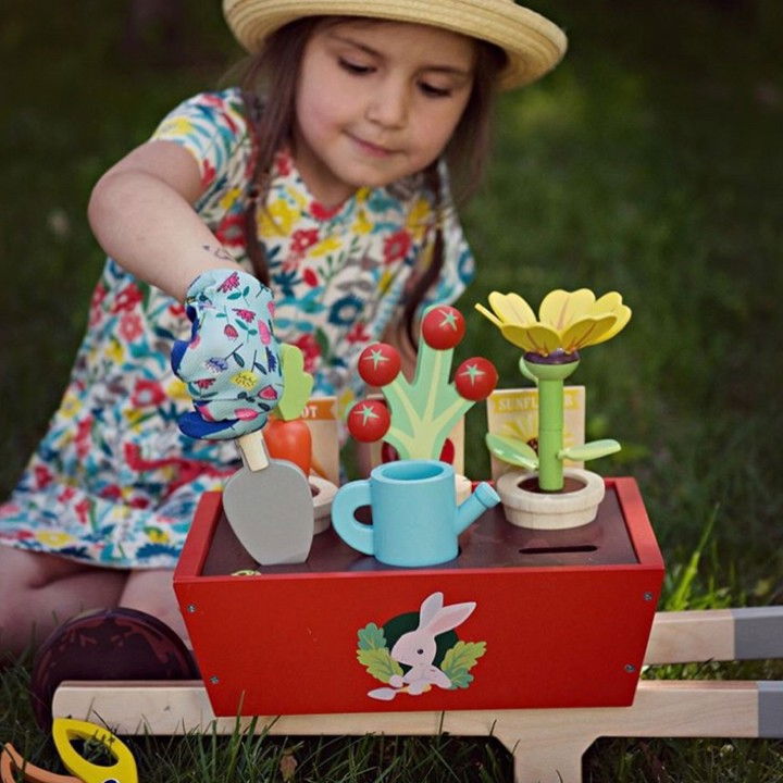Pentru toți grădinarii înflăcărați de acolo ... o roabă solidă din lemn cu 3 pachete de semințe, 3 ghivece de flori de floarea-soarelui, morcov și roșii. Udați plantele cu o stropitoare, îngrijiți-le cu o mistrie și tăiați floarea cu o foarfeca de grădină.