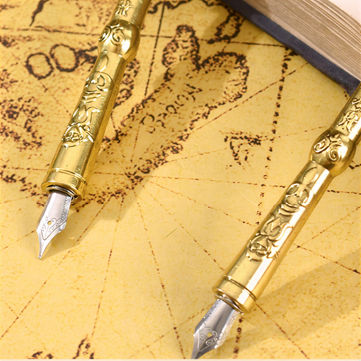 Cerneala inclusa, ambalata intr-un recipient elegant, asigura o scriere fluida si intensa. Setul este completat de o cutie vintage cu design inspirat din pagini de ziar si elemente clasice, perfecta pentru depozitare sau oferire directa cadou.