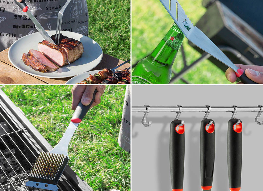 · ustensilele sunt manufacturate din otel inoxidabil fiabil (pregateste-te pentru o viata imbelsugata in gratare), au maner din TPR anti-alunecare (nu-ti scapa niciodata din mana) si rezista la caldura (pana la o lungime de circa 38 cm)