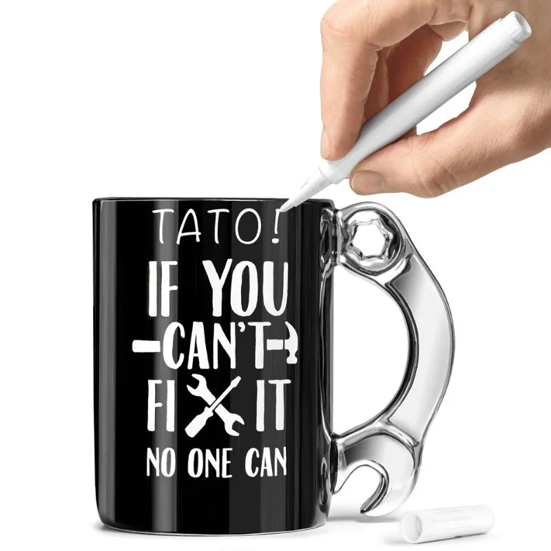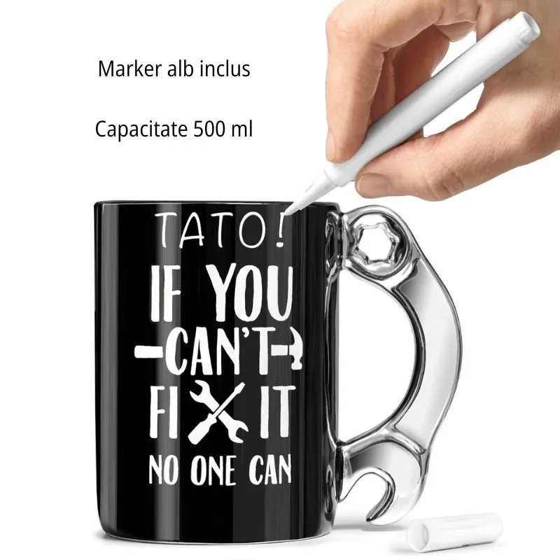 Cana "Eroul casei" este fabricata din portelan de inalta calitate, cu un maner argintiu in forma de cheie plata, ideala pentru cei care adora sa repare lucruri... sau macar sa incerce. Cana include si un marker alb cu stergere uscata pentru a-ti putea scrie propriile mesaje amuzante de fiecare data. Cu o capacitate generoasa de 500 ml, aceasta cana este perfecta pentru orice super-erou al casei.