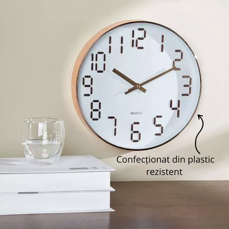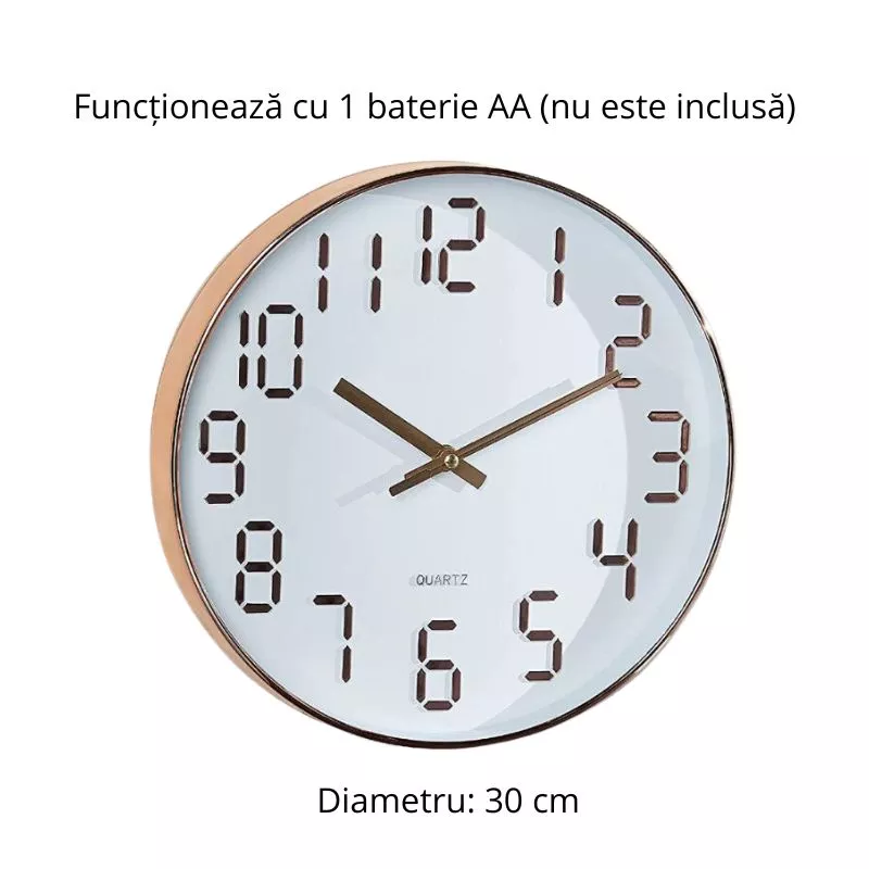 Utilizare: Ceas de perete alb cu cifre aurii se echipeaza cu o baterie care se monteaza la partea din spate, in locul rezervat. Tot de acolo poti seta ceasul la ora din prezent, urmand ca ulterior sa poata fi amplasat oriunde, in orice spatiu, indiferent de forma acestuia.