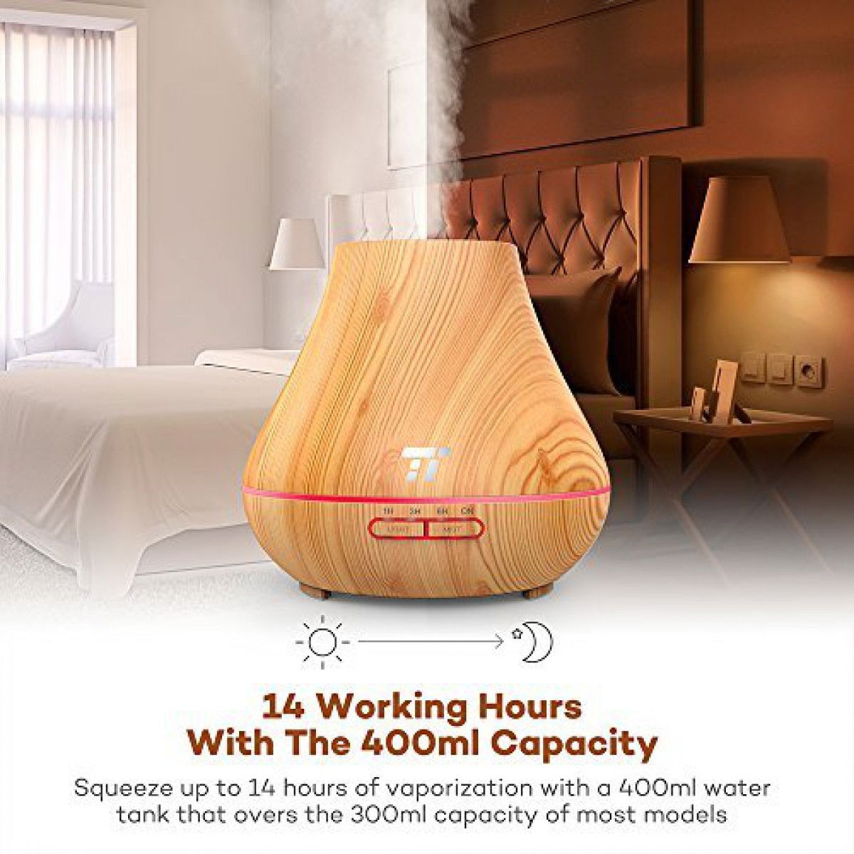 Volum mare - Acest Difuzor Aromaterapie uleiuri esentiale TaoTronics TT-AD004, 400ml, LED, 7 culori are rezervor de apa cu o capacitate de 300 ml, care va ofera pana la 8 ore de functionare cu o singura umplere.