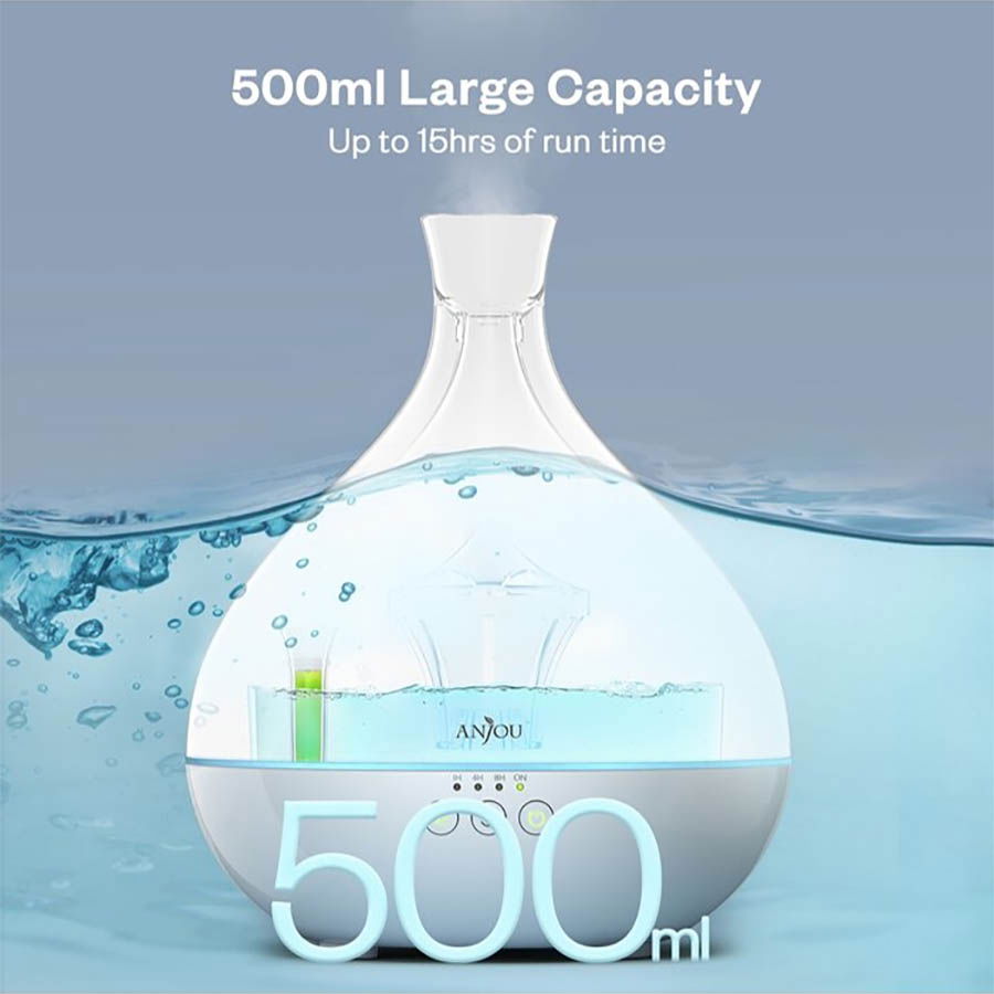 Difuzor aromaterapie uleiuri esentiale Anjou AJ-AD012, 500ml, LED, 7 culori are capacitate imensa de 500 ml pentru 8 ore de utilizare continua. Se poate folosi si in mod temporizator: 1h, 4h, 8h.