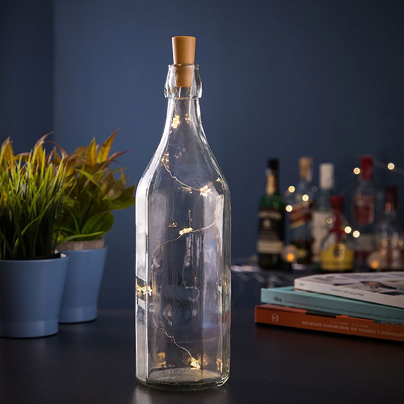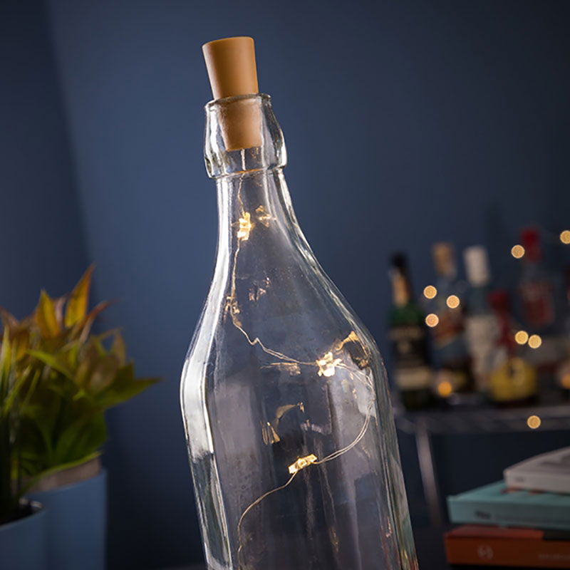 O Instalatie de lumini LED Dopuri de sticla poate fi folosita fara a fi nevoie de priza, functioneaza doar pe baza bateriilor (sunt incluse). Tot ce trebuie sa faci e sa pui instalatia in sticla si sa-i fixezi „dopul”. Poti chiar sa luminezi o sticla plina cu vin, mai ales ca instalatia e waterproof. Pentru a schimba bateriile, vei avea nevoie de o surubelnita. Lumina este Alb-Cald.