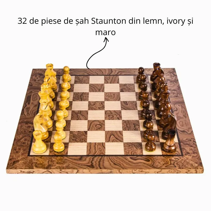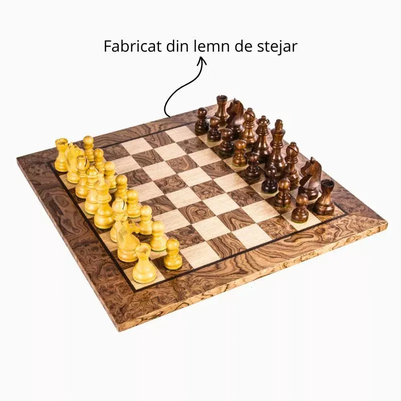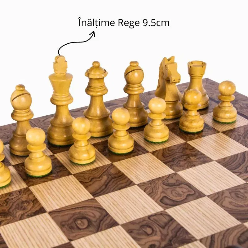 Design si estetica distincte: Jocul de sah se remarca prin designul sau special de textura de nuc. Aceasta adauga o nota de originalitate si eleganta, evidentiindu-se in colectia dumneavoastra de obiecte de sah. Aspectul distinct al setului ii ofera o valoare estetica deosebita.