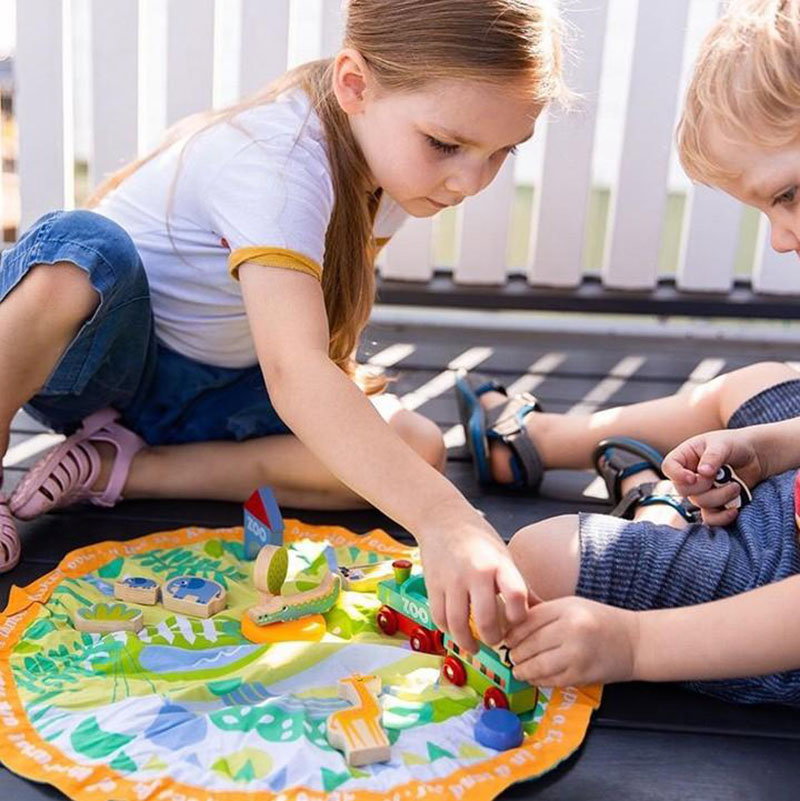 Aceasta traistuta cu povesti din safari are tot ce-ti trebuie pentru a alcatui cateva povesti amuzante cu piesele din lemn: un tren si vagon, girafa, ingrijitor, pinguin, elefant si crocodil. Toate amplasate intr-un sac cu ilustratii care se transforma intr-o plasa pentru joc atunci cand este deschis.