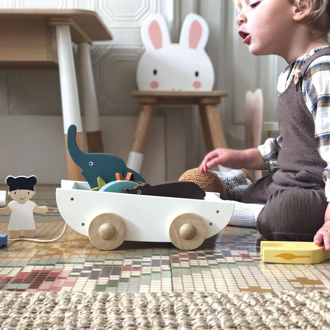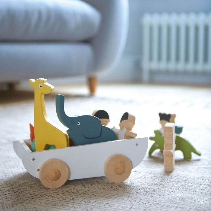 Corabia cu animățuțe, din lemn premium - The Friend Ship - 12 piese Această corabie a prieteniei îl încurajează pe micuțul tău să se miște cu atenție, să gândească critic și să joace imaginativ, toate acestea în timp ce savurează un mod distractiv de a învăța! Jucăriile tractabile din lemn promovează dexteritatea, coordonarea ochi-mâini și manipularea lucrurilor. Ajută-i pe cei mici să-și dezvolte echilibrul, mersul timpuriu și coordonarea mâini-ochi pentruca aceștia să fie fericiți, sănătoși și deștepți! 12 piese - Setul include 12 bucăți de piese din lemn premium, cu două fețe, cu culori calde, așezate într-o corabie frumoasă din lemn. Ansamblul de animale prezintă elefantul, girafa, furnicarul, balena, vulpea, pinguinul, ursul, un băiețel și o fetiță, fiecare purtând un șoricel și o pasăre. Trageți-le în drăguța lor barcă albă cu roți din lemn.