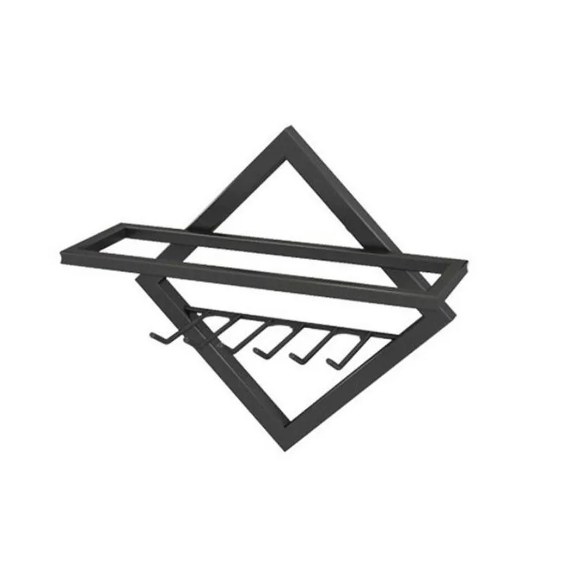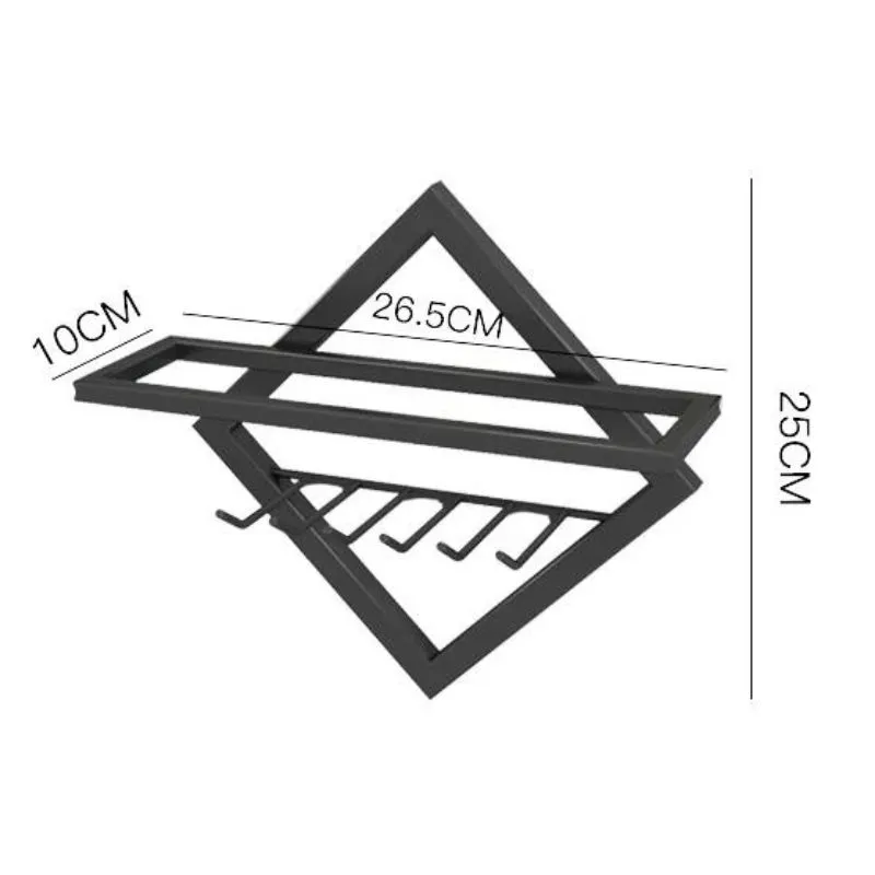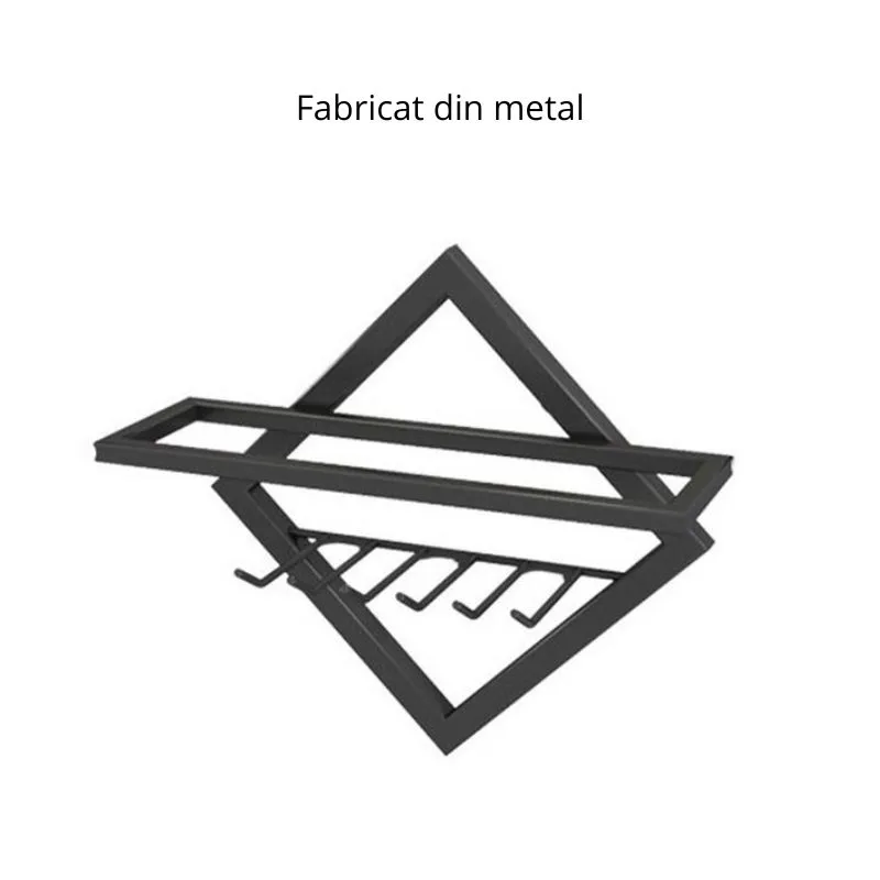 Acest suport de perete pentru sticla si pahare de vin este confectionat din metal rezistent si are un design modern, sub forma de doua triunghiuri suprapuse, ce adauga un aspect geometric interesant oricarui perete. Suportul este ideal pentru depozitarea eficienta a unei sticle de vin si a patru pahare, economisind spatiu si adaugand un accent decorativ deosebit. Dimensiunile compacte de 26.5cm x 25cm si adancimea de 10cm il fac usor de integrat in bucatarie, living sau orice alt spatiu dedicat relaxarii si socializarii.