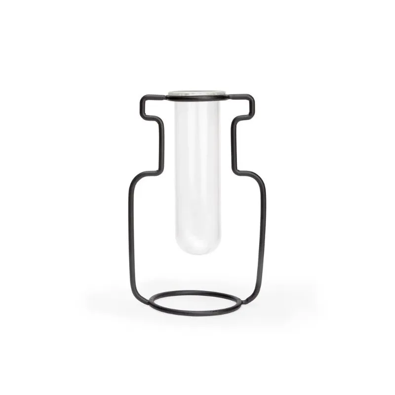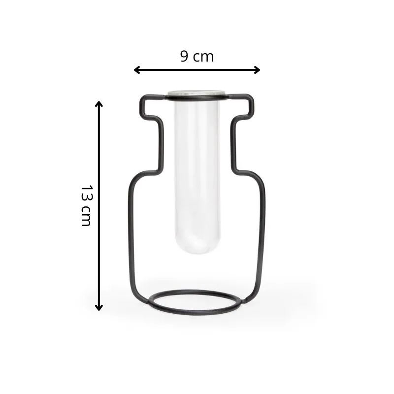 Designul sau ingenios si modern ofera un cadru perfect pentru observarea radacinilor plantelor in crestere, permitandu-ti sa urmaresti indeaproape dezvoltarea lor. Sticla transparenta ofera o vizibilitate clara, facand acest proces de propagare nu doar functional, ci si vizual placut. Suportul metalic, cu linii curate si precise, asigura stabilitatea vazei.