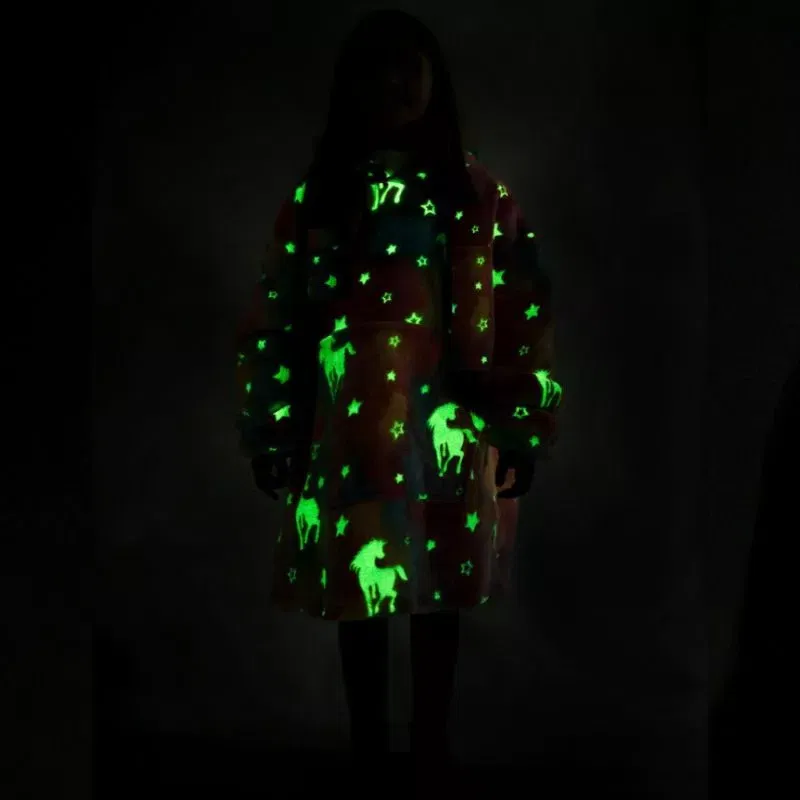 Hanorac patura cu maneci fete Unicorn Fosforescent cu buzunar cangur, Flanel & Polar, 440gmp, 105 cm este