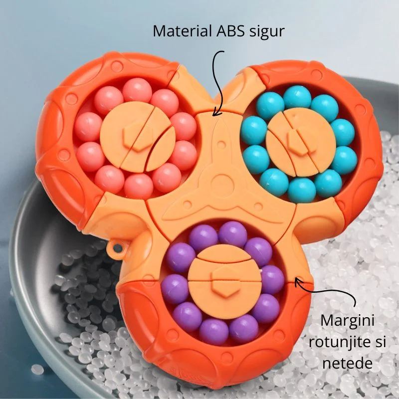 Aceasta jucarie 2-in-1 este o combinatie creativa intre cub Rubik si spinner antistres, conceputa special pentru copii cu varsta intre 4 si 6 ani, dar care poate cuceri si adolescenti ori adulti stresati. Forma sa ergonomica si compacta, cu 3 cercuri rotative independente pline cu bilute viu colorate, stimuleaza gandirea logica, coordonarea mana-ochi si motricitatea fina.