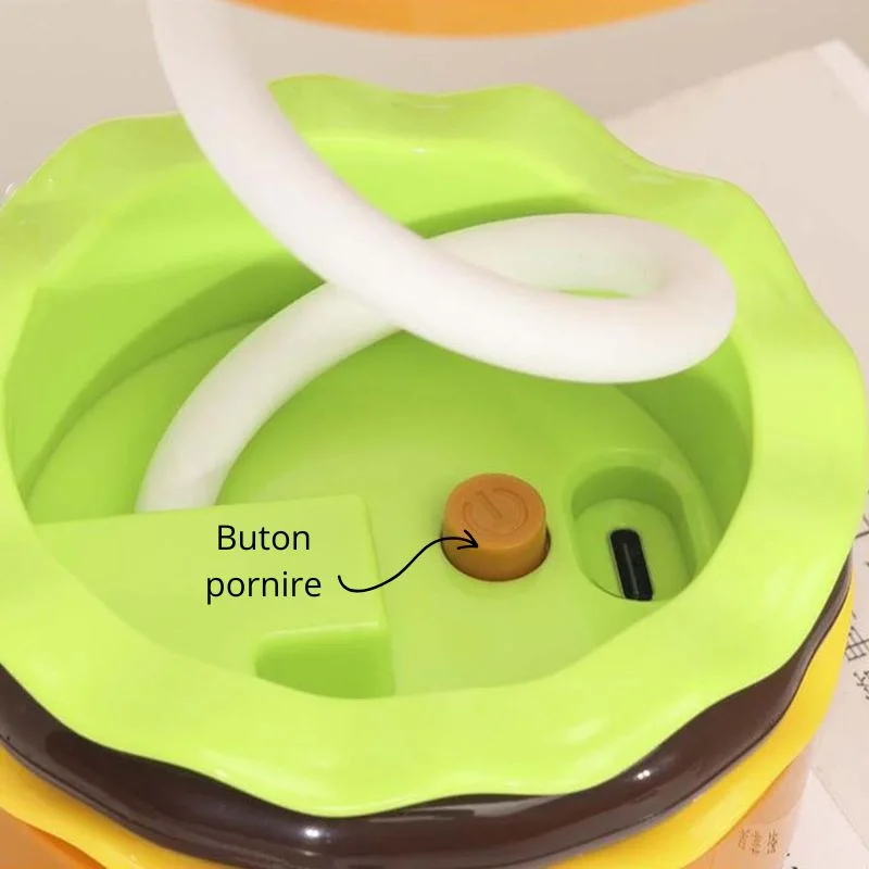 Lampa se activeaza prin apasarea butonului de pornire situat in interior, fiind alimentata prin cablu USB Type-C. Bratul flexibil permite ajustarea unghiului de iluminare, iar lumina este blanda si potrivita pentru citit sau lucru. Ascutitoarea este ascunsa in baza si se poate accesa rapid pentru creioane. Interiorul ofera si un spatiu mic de depozitare, ideal pentru obiecte marunte. Este ideala pentru camera copiilor, birou, noptiera sau coltul de lectura. Dupa utilizare, capul lămpii se pliaza complet, iar produsul devine un burger decorativ simpatic.