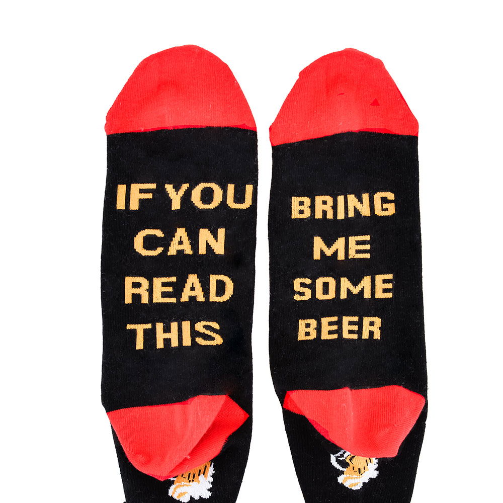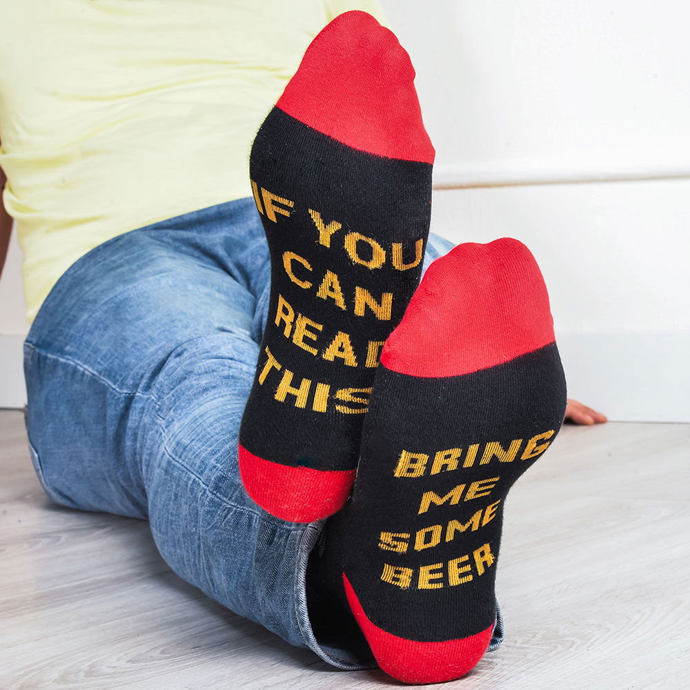 Hai cu picioarele in aeeer! Intinde-le la vedere si priveste cum doza ta de bere se roteste pana la tine in mana. Asta daca tragi speranta ca cineva iti va vedea sosetele super amuzante si i se va face mila de tine. Aceste Sosete amuzante Bring Me Beer sunt haioase, atrag atentia si multe zambete. Sunt un cadou de Craciun ideal pentru barbati (sau pentru femei), pentru iubitorii de bere si cei ce stiu sa pretuiasca un cadou amuzant, cadou de petrecere, cadouri haioase, pentru zile de nastere, onomastica, cadoul ideal pentru Secret Santa si alte ocazii speciale si ne-speciale. Cheers to that!