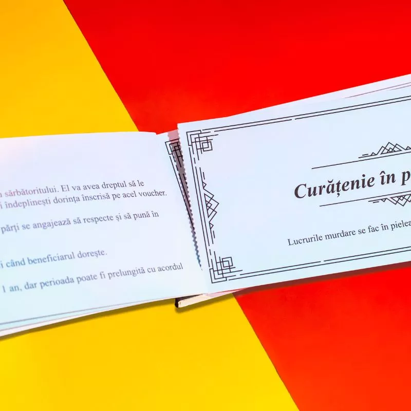 • Toate voucherele sunt printate pe un carton gros de calitate si sunt prinse intr-o brosura-pachet dreptunghiulara