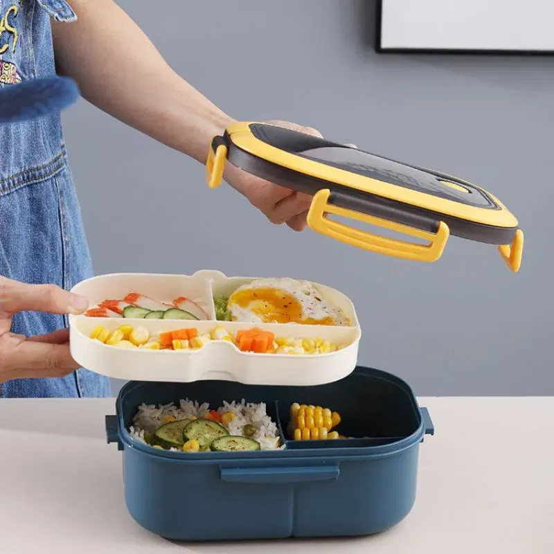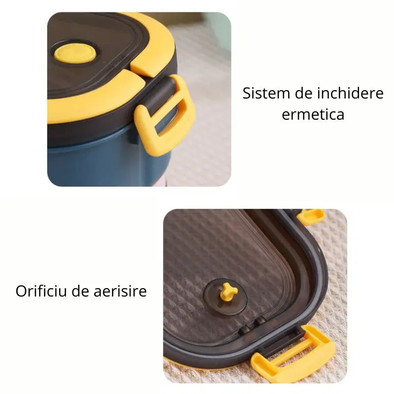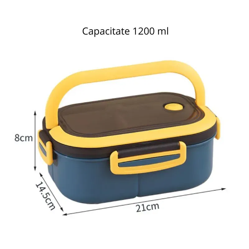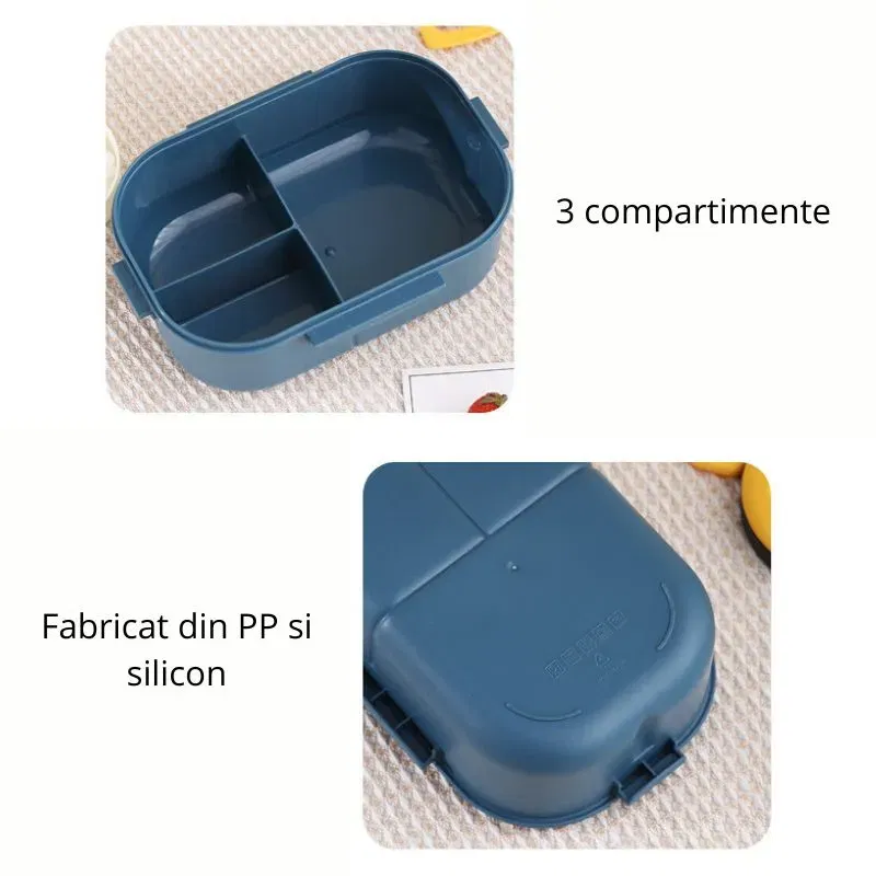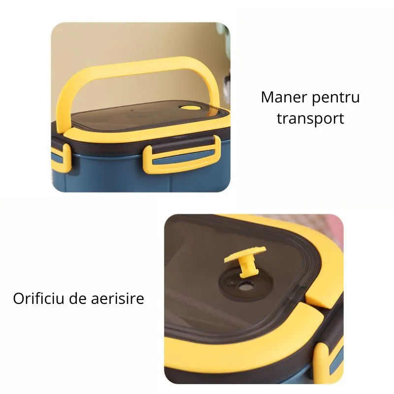 Utilizare: Cutia de pranz portabila este foarte usor de folosit. Pune diferitele tipuri de alimente in cele trei compartimente, inchide ermetic capacul si foloseste orificiul de aerisire pentru a elibera presiunea. Manerul practic permite transportul facil al cutiei, iar materialele durabile asigura o utilizare indelungata. Cutia este usor de curatat, fiind compatibila cu masina de spalat vase.