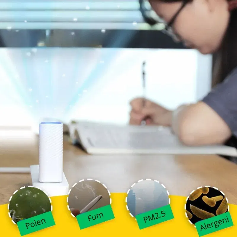 Acest purificator de aer USB, disponibil in culorile alb si negru, este un accesoriu esential pentru oricine isi doreste un aer mai curat si mai proaspat, indiferent de locatia in care se afla. Cu un design minimalist si compact, purificatorul se potriveste perfect in masina, birou sau acasa. Este echipat cu un port USB si poate fi conectat cu usurinta la laptop, incarcator auto sau orice alta sursa de alimentare USB, facandu-l extrem de versatil. Tehnologia sa avansata emite ioni negativi care elimina particulele nocive din aer, precum praf, alergeni, bacterii si mirosuri neplacute, oferindu-va un mediu mai sanatos si mai curat.