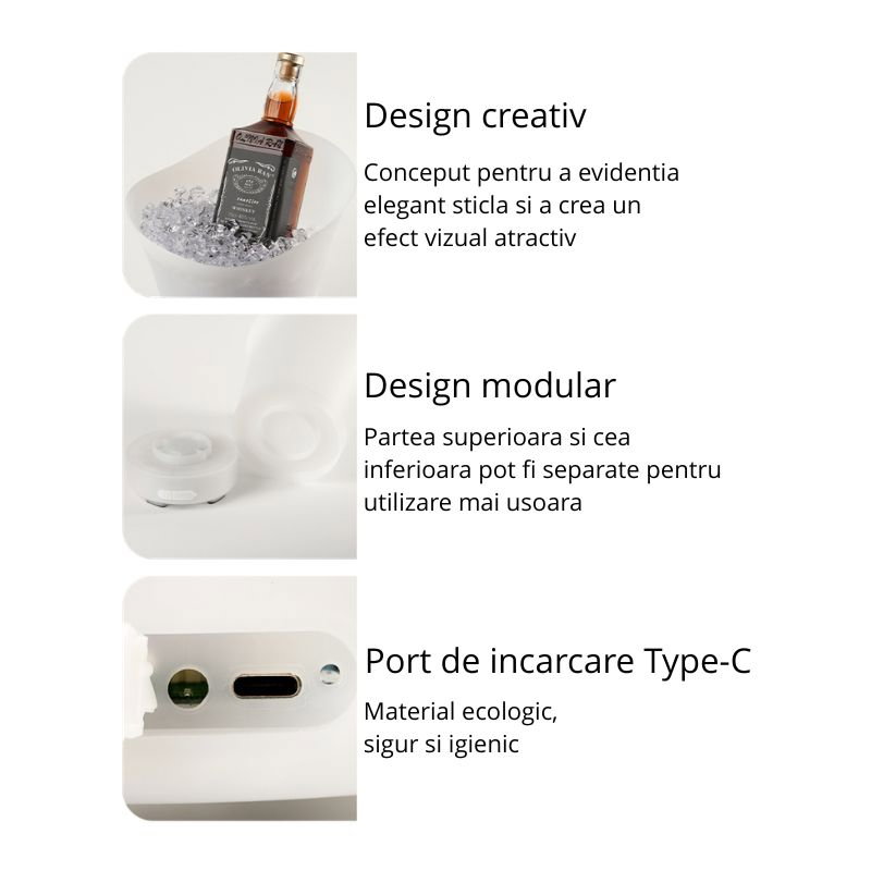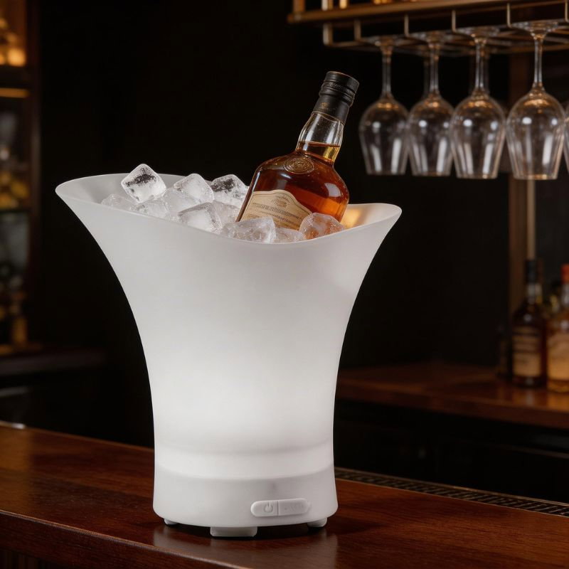 Frapiera cu iluminare LED si boxa Bluetooth de 7 litri este un accesoriu modern pentru petreceri, baruri sau evenimente speciale. Designul sau elegant si futurist transforma simpla racire a bauturilor intr-un adevarat element decorativ. Lumina LED integrata creeaza o atmosfera ambientala placuta, ideala pentru seri relaxante, petreceri sau cine festive.
