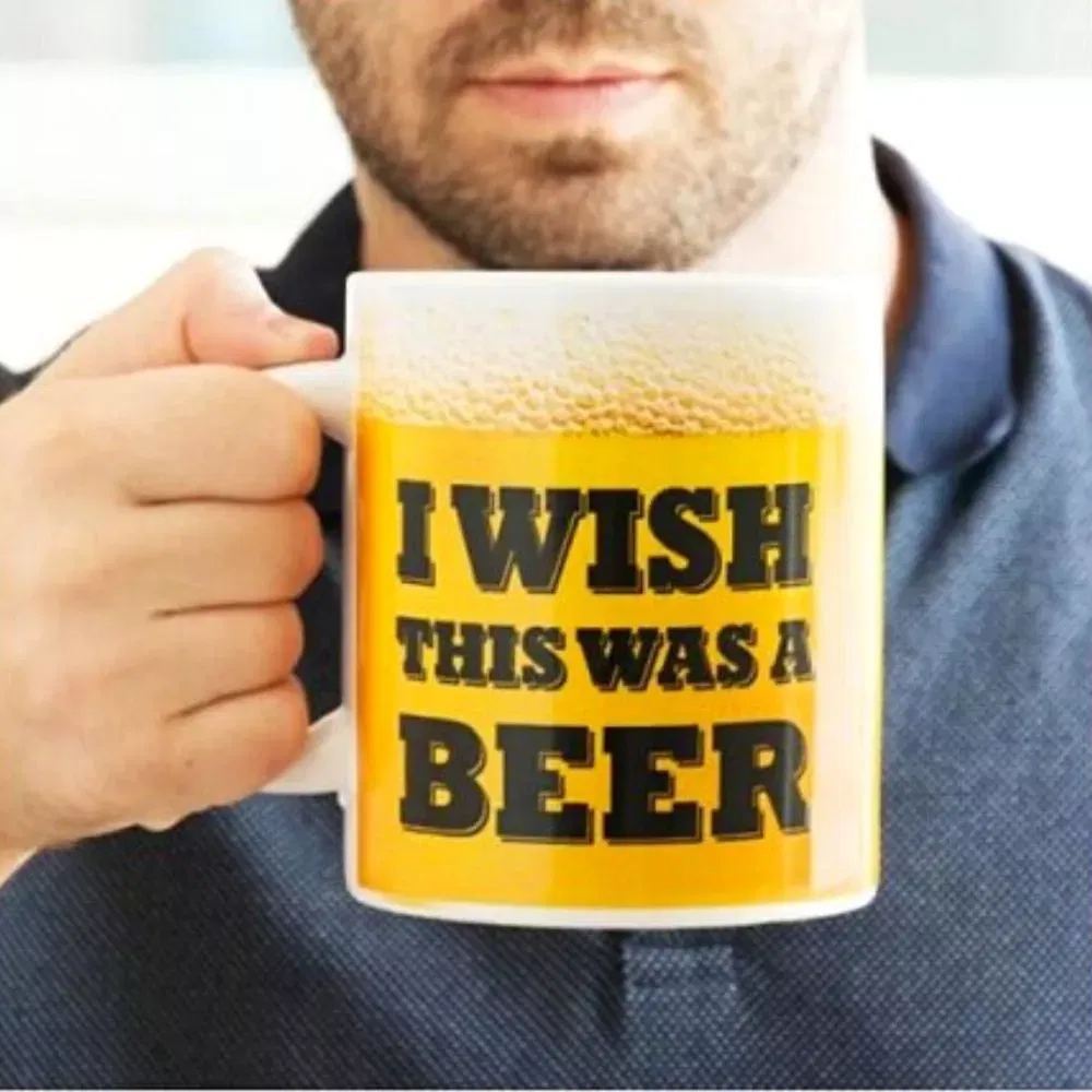Cu totii avem vise marete: unii sa aiba o casa cu piscina in locul unei garsoniere tip cutie de chibrituri, altii sa se bucure constant de multe femei si bineinteles... bere, MUUUULTA BERE. Dar daca totusi pare un vis imposibil, poate din pricina partenerei care insista ca cheltui prea mult sau ca te ia flama la dupa fiecare pahar, iti poti acompania agonia cu cana amuzanta I wish this was a beer. Cu fiecare inghititura de cafea, suc sau apa, vei sti ca esti un adevarat pasionat de bere, chiar daca situatia nu-ti permite sa te bucuri obligatoriu de o blonda care sa-ti aline durerea din suflet.