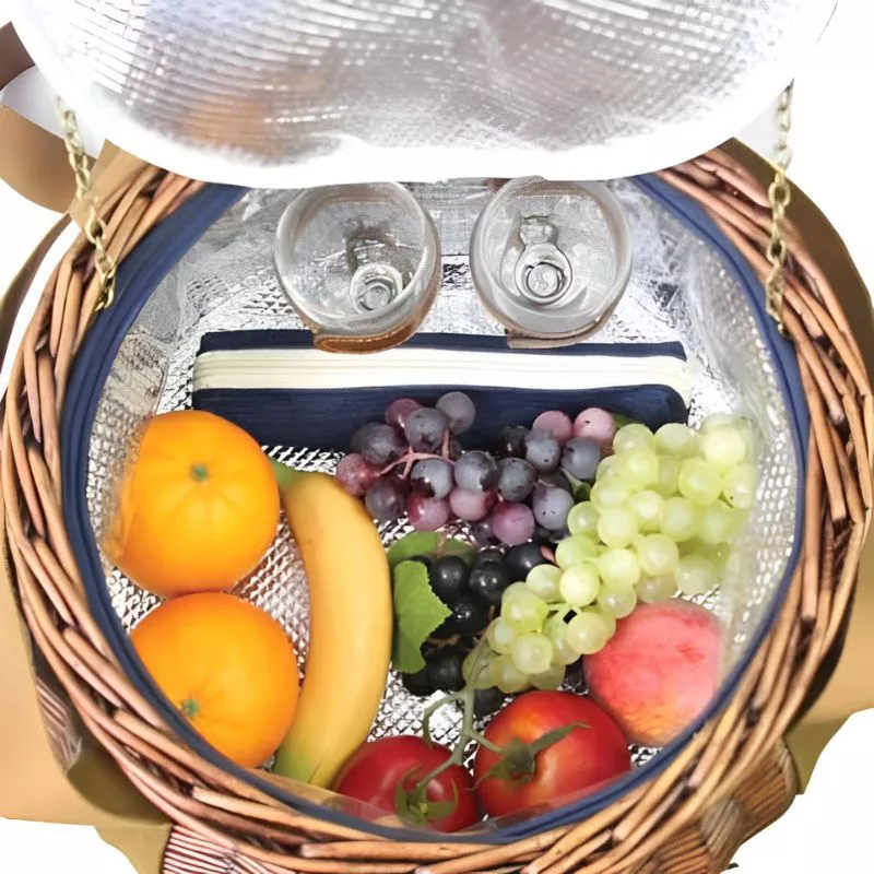 Vine insotit de 2 platouri din ceramica si 2 pahare, alaturi de cate un set de tacamuri pentru fiecare. Se va indragosti din cale-afara de acestt cos picnic rachita pentru faptul ca e elegant, captusit la interior cu bumbac albastru, dar si pentru ca izoleaza cu usurinta continutul astfel incat aroma preparatelor pregatite cu dragoste sa nu-si ia zborul cu usurinta.