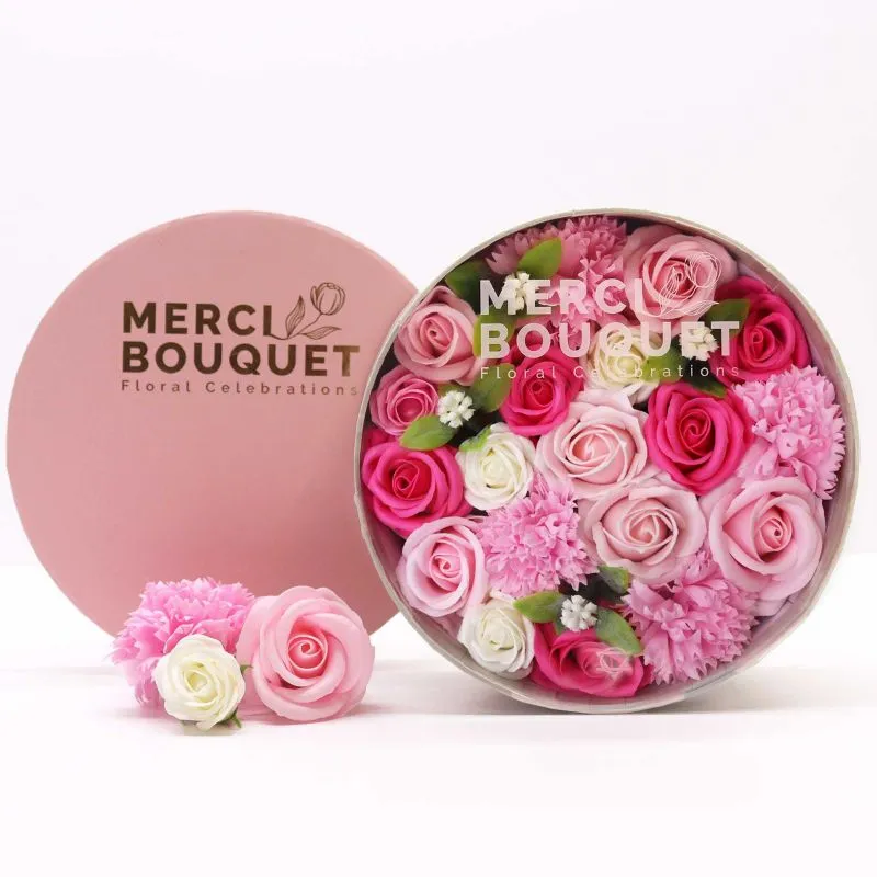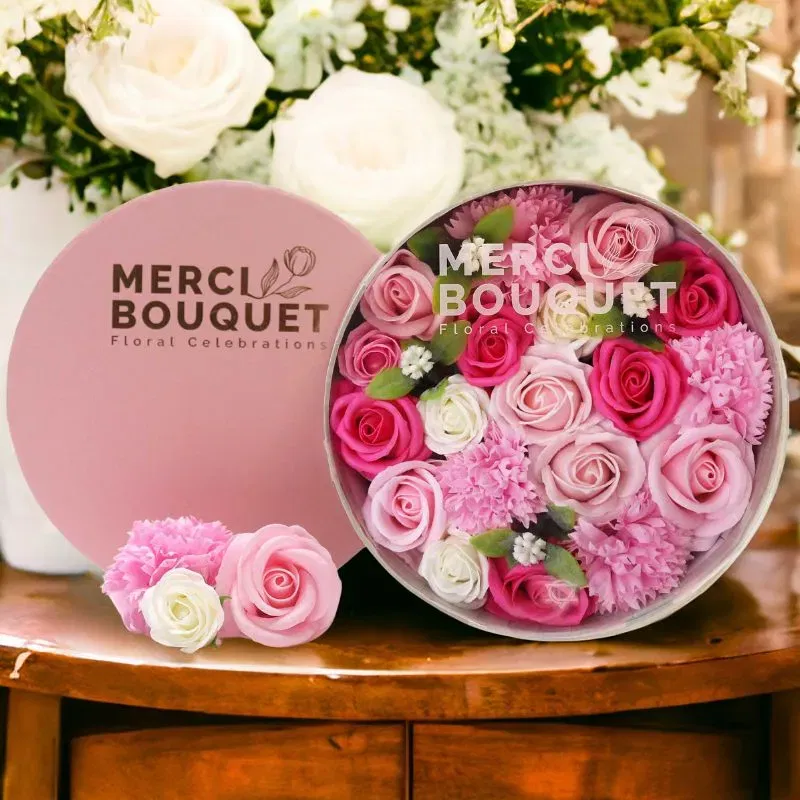 Fiecare floare este meticulos realizata pentru a se asemana cu florile naturale, avand culori vibrante si detalii realiste in nuante delicate de roz si alb. Acest aranjament floral este perfect pentru a fi folosit atat ca decor, cat si ca sapun parfumat, oferind un element de lux si functionalitate.