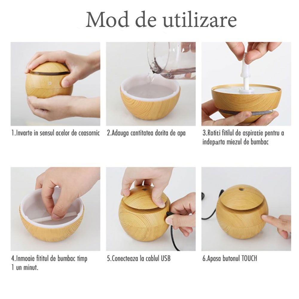 Utilizare: Cu o capacitate de 130 ml, acest Difuzor Aromaterapie uleiuri esentiale sfera 7 culori, 130 ml are dimensiuni compacte si poate usor mutat dintr-un loc in altul. Cand vine vorba despre alegerea uleiurilor esentiale dorite, doar cerul este limita.. aaa... si preferintele tale in materile de miros si aroma. Dar, crede-ne pe cuvant - ai de unde sa alegi. Experimenteaza cat mai multe sau ramai fidel catorva din ele.