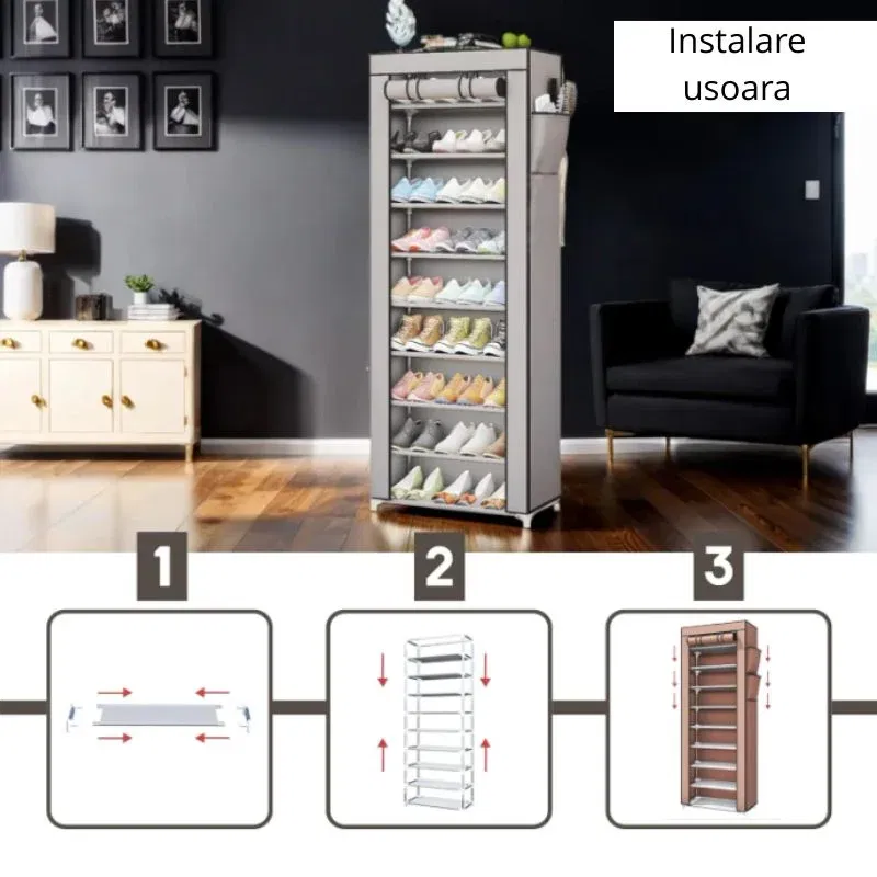 Se monteaza in doar cateva minute si devine rapid centrul de organizare al incaltamintei. Incape perfect in spatii inguste si ajuta la pastrarea ordinii si curateniei in fiecare colt de casa.