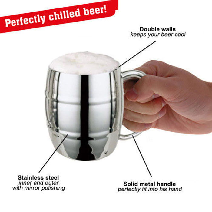 Utilizare: Halba de bere cu racire Iron Chiller 450 ml Realizata din otel inoxidabil cu pereti dubli, asa cum torni berea, asa o bei. Constructia acestei halbe de bere are capacitatea de a intra in schema si de a se mula dupa temperatura luchidului, pe care o va mentine de altfel un timp indelungat. Fie ca o servesti dintr-o gurita barbateasca, fie cu picatura, berea se va mentine rece ca gheata si tare ca fierul pe tot parcursul tau de relaxare. Iar aspectul de oglinda iti permite inca o data sa-ti privesti reflexia si sa-ti multumesti cu narcisism pentru alegerea inteleapta.