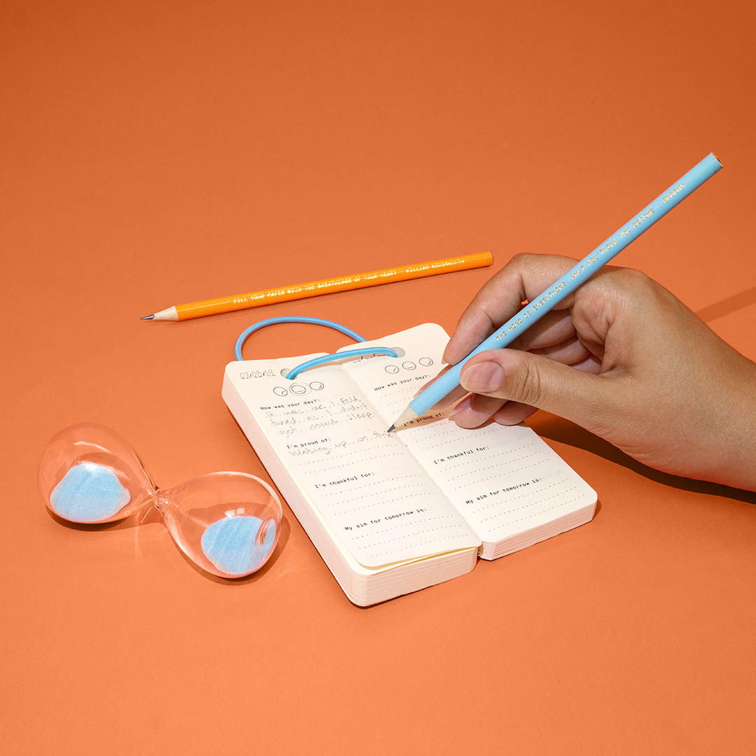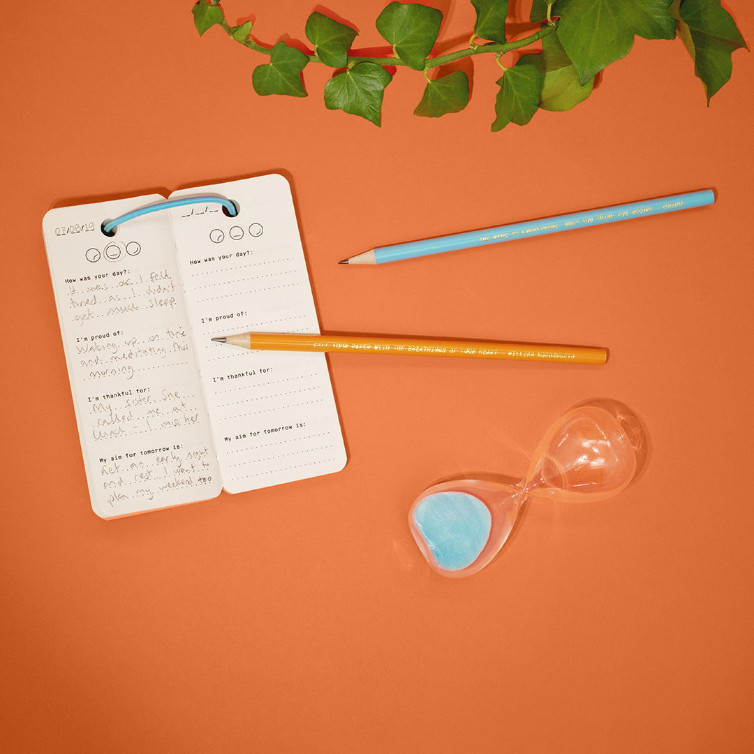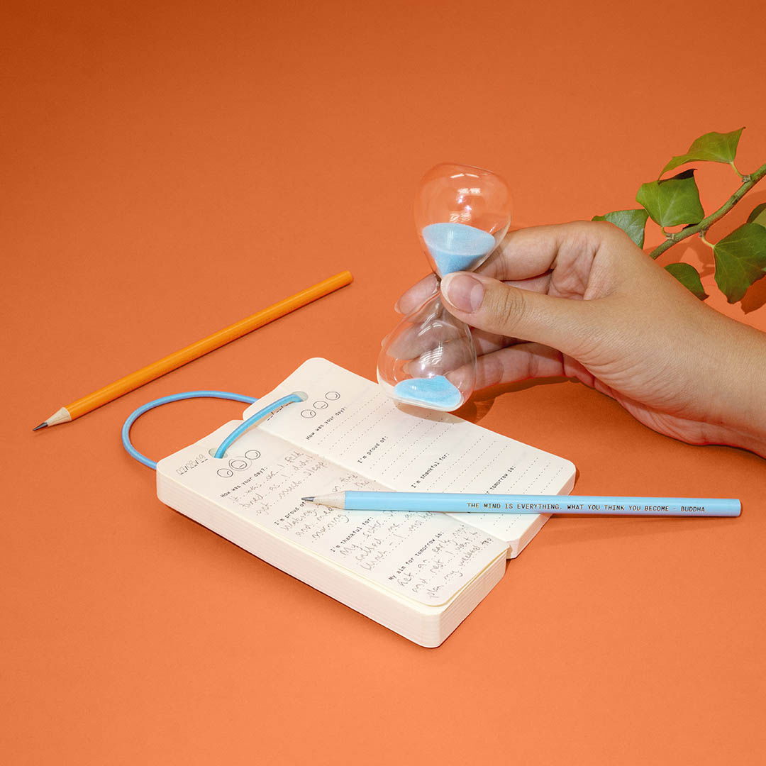 Utilizare: Foloseste carnetelul de dimensiuni reduse pentru a raspunde la cateva intrebari zilnice care te pot canaliza spre o energie mai pozitiva. Simte mirosul parfumat al celor doua creioane din pachet si ridica in picioare clepsidra mica, pentru a permite nisipului sa se scurga timp de 10 minute. Chiar 10 minute - de atat ai nevoie zilnic ca sa-ti gasesti echilibrul, sa inveti sa multumesti pentru ceea ce ai si sa-si setezi noi repere de atins pentru ziua de maine.