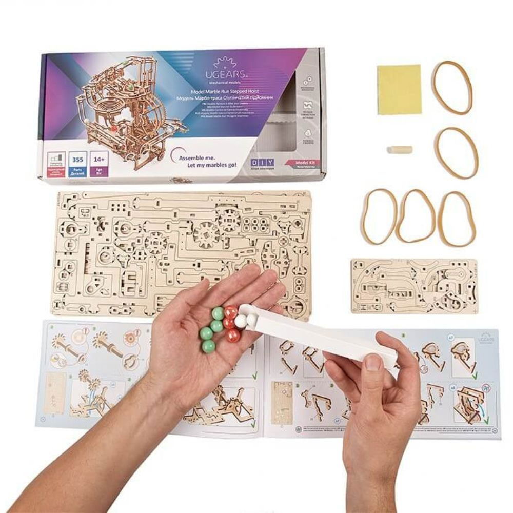 Distractia cu bilele de marmura continua cu Marble Run Tired de la Ugears, al treilea dintr-o serie de piste modulare Ugears. Acest model este atat un puzzle 3D, cat si o jucarie distractiva. Palanul cu niveluri Marble Run are un lift fascinant, trei elemente noi de senile si mecanisme interesante de captare si de eliberare peste tot. Rotiti manivela si urmariti cum bilele isi fac calatoriile prin diverse obstacole pana la tava de colectare de mai jos. Mai multe piese si elemente sunt impachetate intr-un spatiu compact in aceasta pista de marmura DIY bine conceputa.