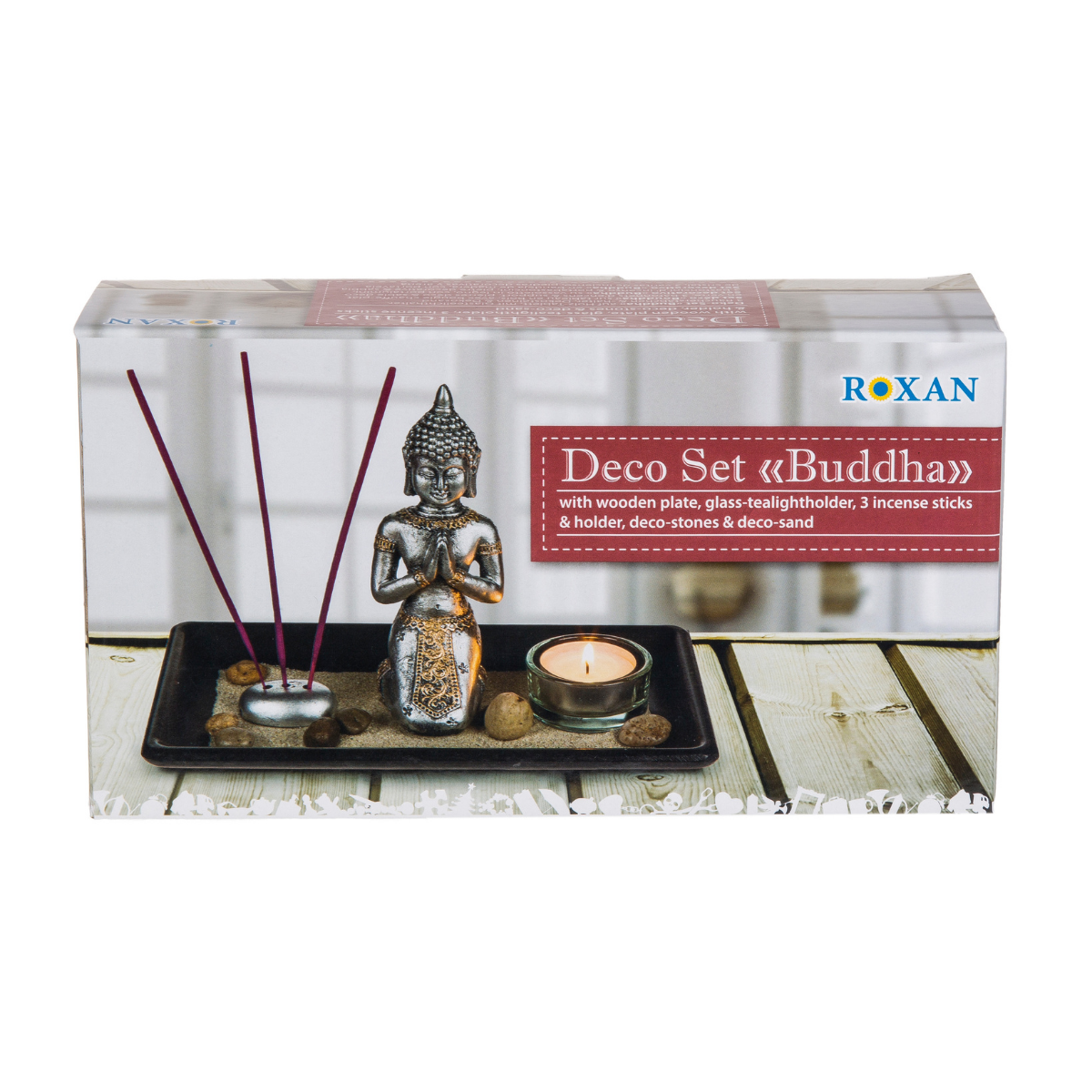 Foloseste betioasele parfumate pentru a elibera o aroma perfecta pentru o stare meditativa, calmitate si relaxare. In suportul din sticla poti aseza o lumanare-pastila, iar pietrele si nisipul decorativ vor contribui la conturarea unei experiente desavarsite de meditatie. Statuia il infatiseaza pe Buddha, in straie autentice, cu mainile impreunate la piept si cu ochii inchisi, in stare de rugaciune. Toate obiectele sunt plasate pe o tavita, ca un mic coltisor de evadare. Set cadou Deco Buddha este un cadou unic.