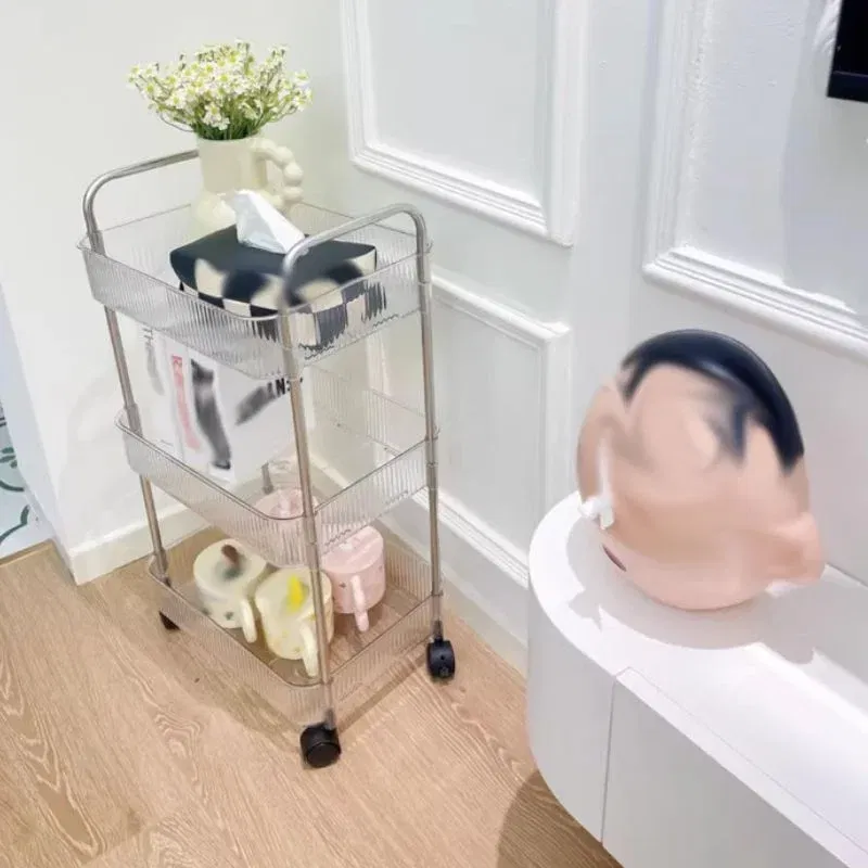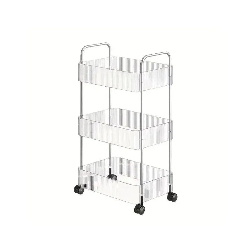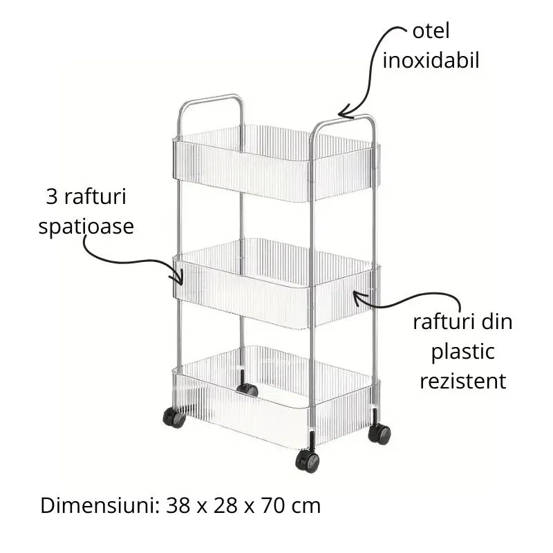 Suportul de depozitare mobil cu 3 rafturi este aliatul ideal in orice casa moderna. Cu un design transparent si elegant, se potriveste perfect in spatii mici sau medii, oferind o solutie smart pentru depozitare verticala, usor de mutat dintr-o camera in alta.