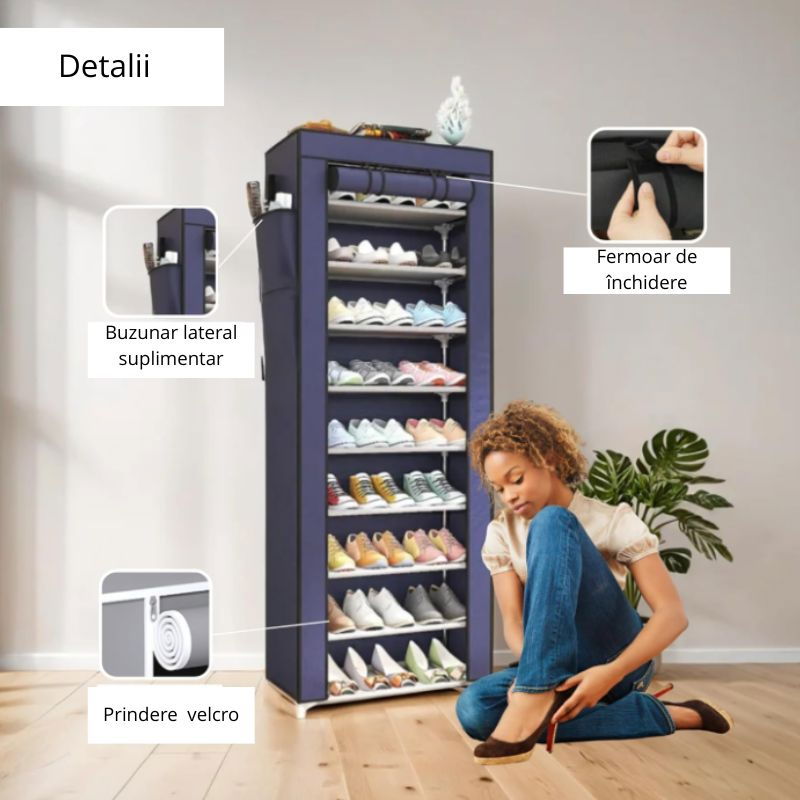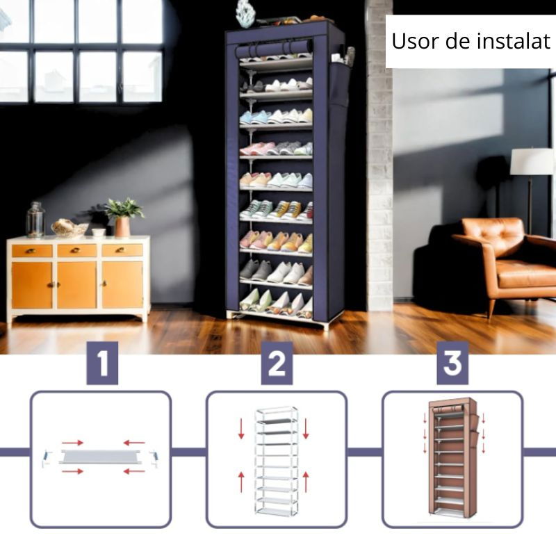 Se monteaza rapid si poate fi amplasat in orice colt de casa. Rafturile sustin incaltamintea in mod ordonat, iar husa cu fermoar o protejeaza de praf si umezeala. Accesul este rapid, fara sa deranjezi toate perechile.