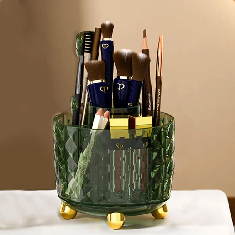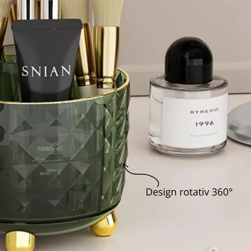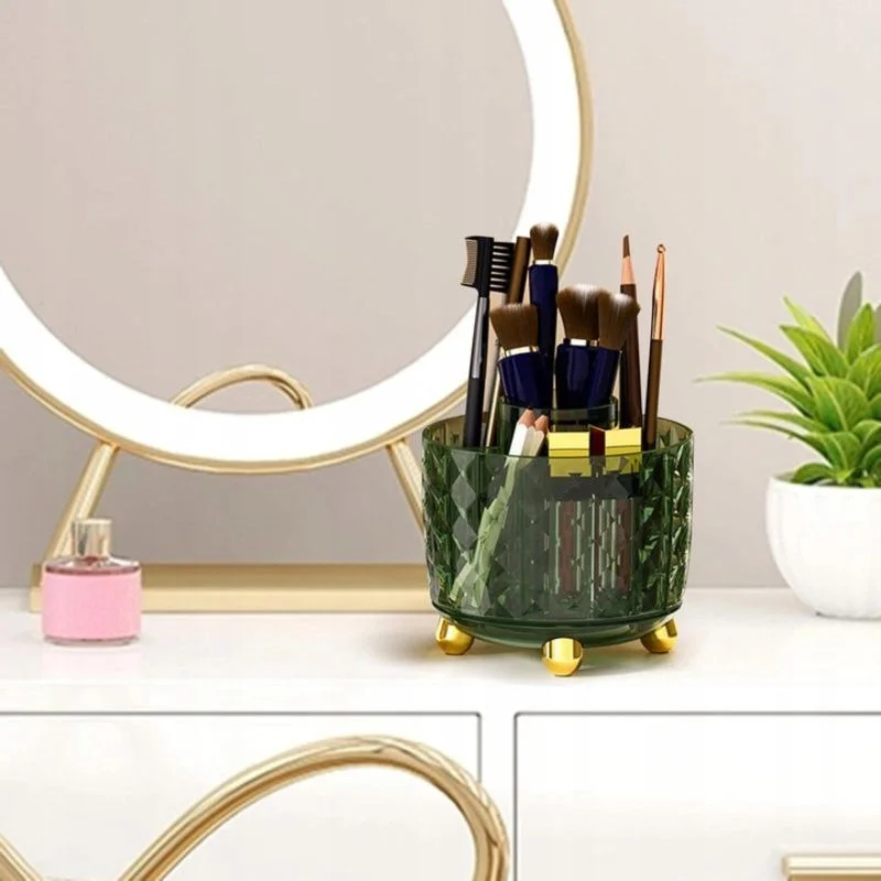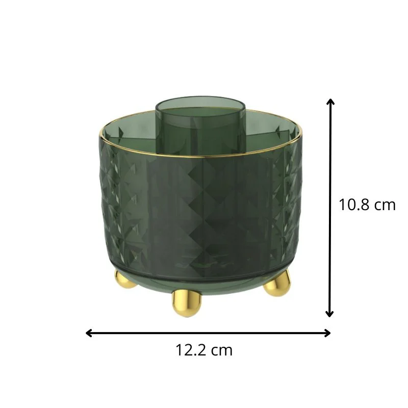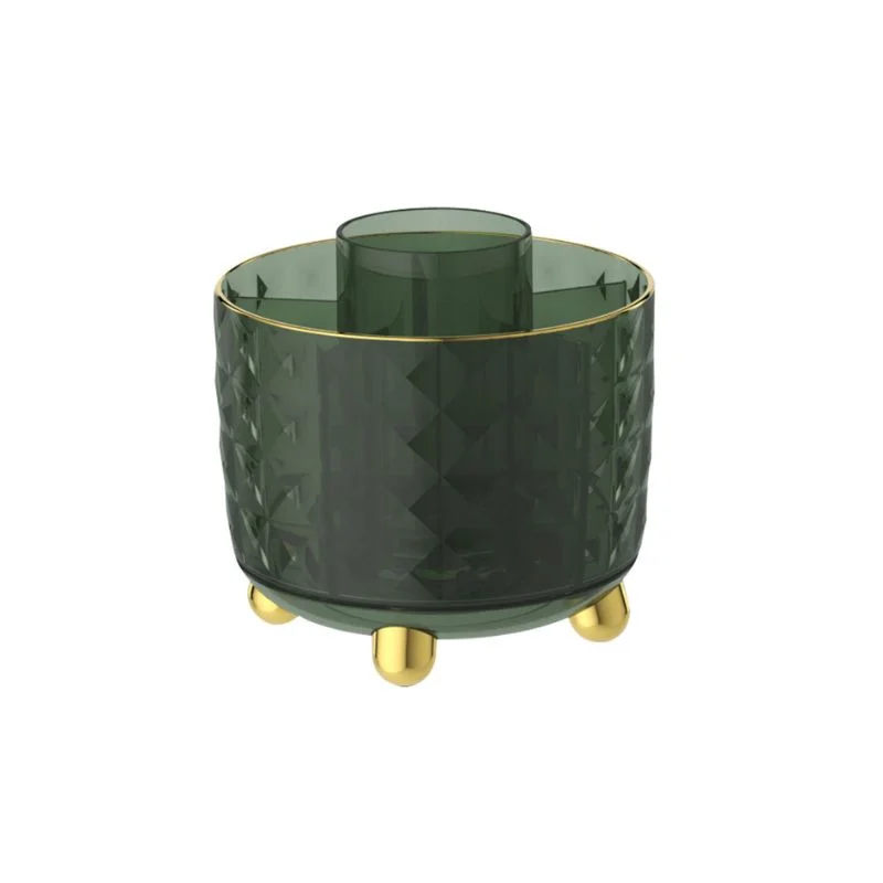 Acest suport pentru pensule de machiaj este nu doar un organizator, ci si o declaratie de stil. Realizat din material plastic transparent de culoare verde inchis, cu design fatetat si accente aurii, acest produs combina perfect luxul discret cu functionalitatea moderna. Cele 4 picioruse aurii adauga stabilitate si un plus de eleganta, transformandu-l intr-o piesa decorativa in sine.
