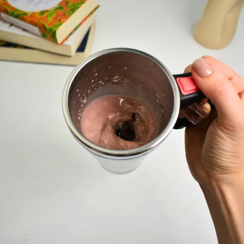 Aceasta cana geniala este gadgetul perfect pentru dimineti lenese sau pauze de lucru cand nu vrei sa ridici nici macar o lingurita. Cu o simpla apasare de buton, cafeaua, ceaiul sau ciocolata calda se amesteca automat, uniform si fara efort. Motorul incorporat este alimentat de doua baterii AAA si asigura o rotatie puternica, dar silentioasa, care transforma bautura intr-o spuma fina si perfecta.