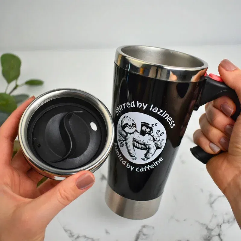 Designul ei modern, cu mesajul „Stirred by laziness, fueled by caffeine”, aduce un strop de umor oricarei zile. Este un cadou excelent pentru iubitorii de gadgeturi, pentru cei care nu functioneaza fara cafea sau pentru persoanele care pur si simplu adora sa-si faca viata mai usoara.