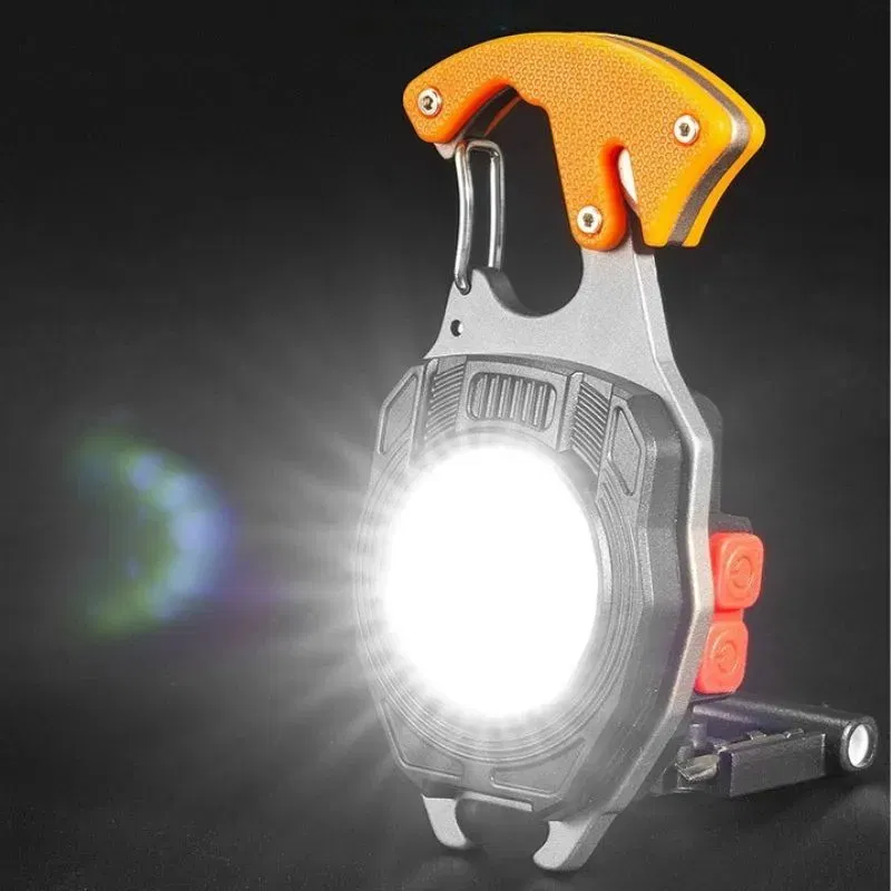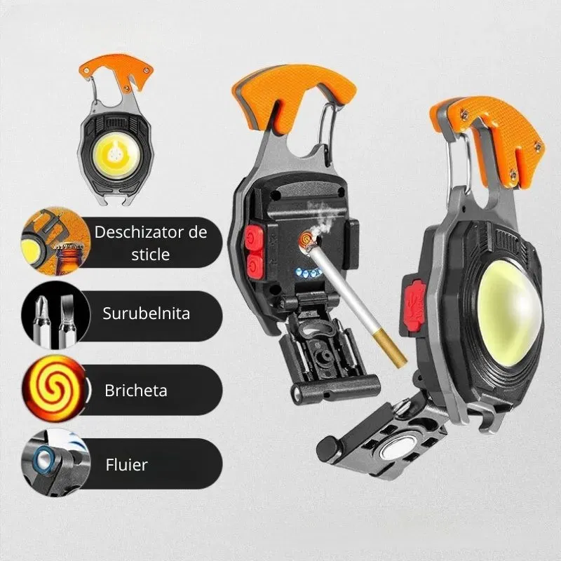 Aceasta lanterna nu este doar o sursa de lumina puternica, ci si un instrument multifunctional. Include deschizator de sticle, bricheta, taietor, fluier de supravietuire, magnet, surubelnita si cutit, fiind perfecta pentru drumetii, camping, calatorii nocturne si autoaparare. Alimentata de o baterie reincarcabila de 500 mAh, se incarca rapid prin intermediul unui cablu USB Type C si ofera o autonomie impresionanta.