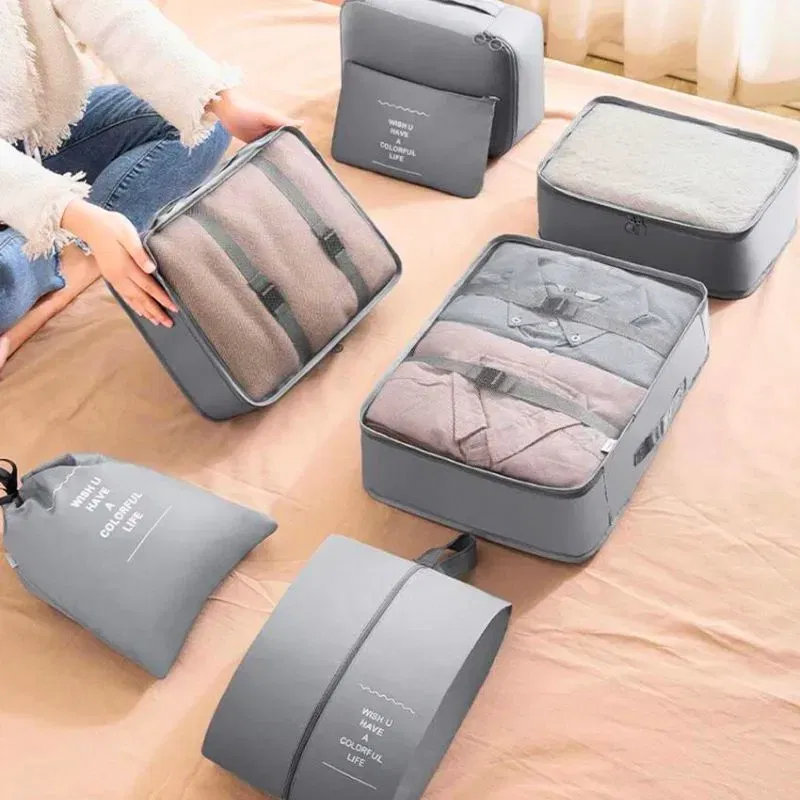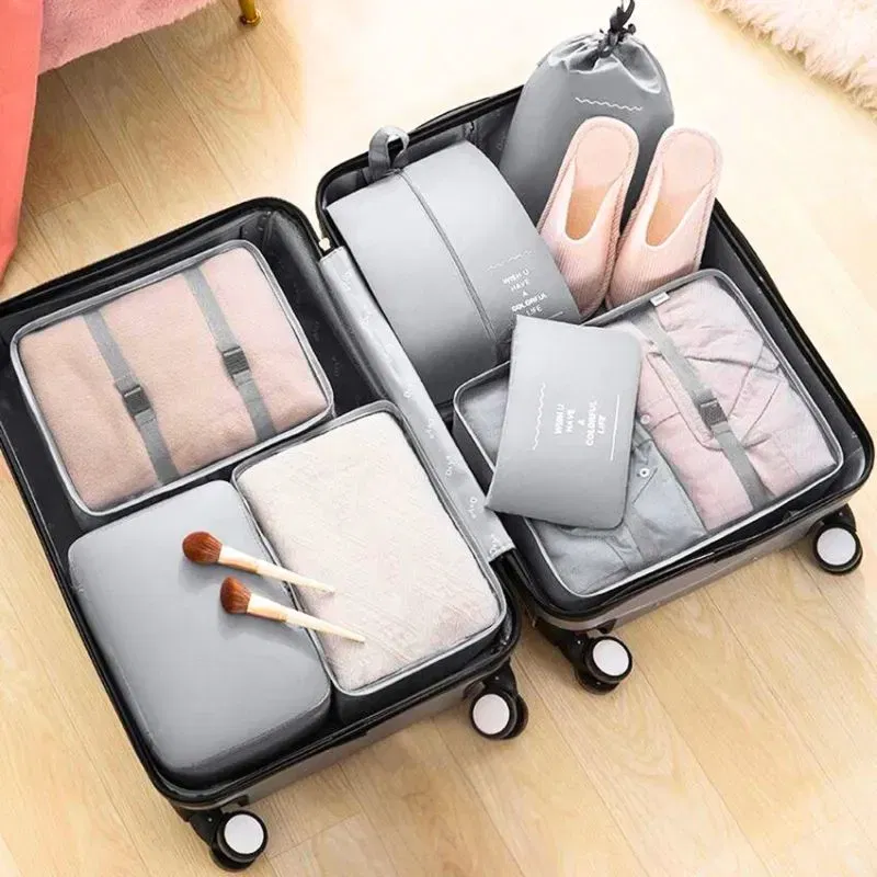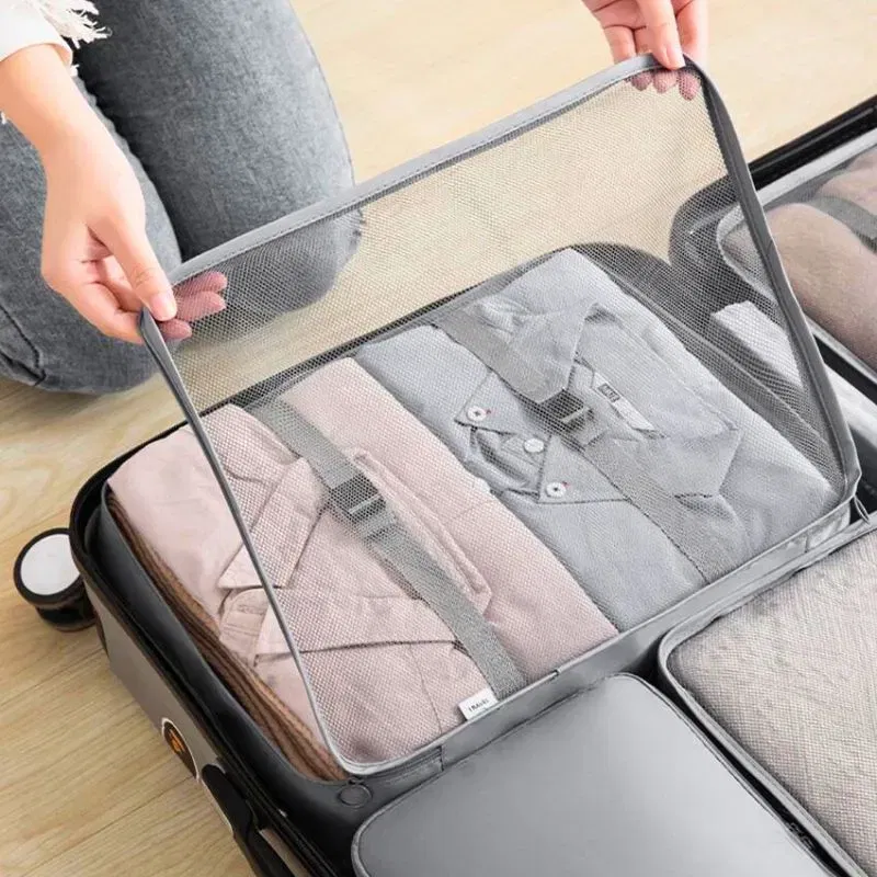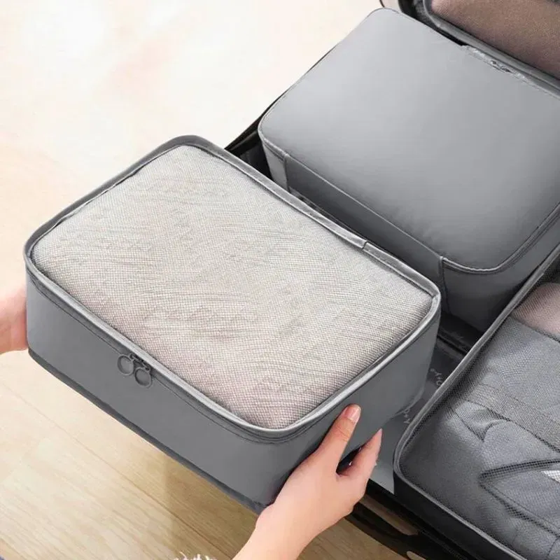 Setul de 7 huse pentru organizarea bagajului in culoarea gri este solutia perfecta pentru calatoriile tale. Aceste huse sunt concepute pentru a-ti mentine lucrurile organizate, economisind timp si spatiu. Setul contine huse de diverse dimensiuni si forme, adaptate pentru diferite tipuri de articole de imbracaminte si accesorii.
