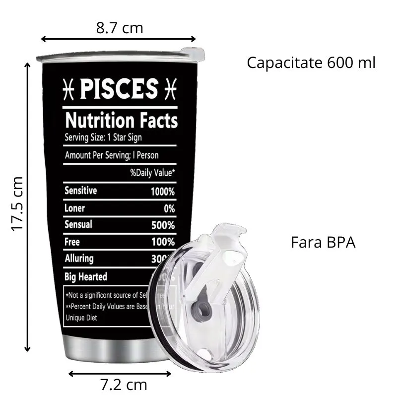 Cu un design elegant si artistic, decorat cu simbolul Pestilor, acest termos este creat pentru cei empatici si creativi. Fabricat din otel inoxidabil de calitate superioara si avand o capacitate de 600 ml, acest termos nu doar ca este practic, dar si extrem de durabil. Fara BPA si dotat cu un capac etans, asigura o utilizare sigura si placuta pe parcursul intregii zile. Este mai mult decat un simplu recipient, este un accesoriu ce imbina utilitatea cu personalitatea profunda si senzuala a semnului Pesti.