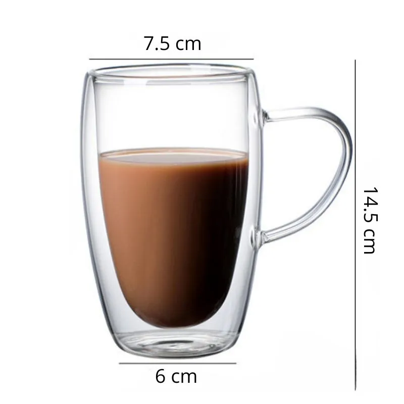 Cana este realizata din sticla transparenta cu pereti dubli, avand o capacitate de 450 ml. Designul inovator cu pereti dubli ofera o izolatie termica excelenta, mentinand bautura calda sau rece pentru mai mult timp. Dimensiunile de 5 x 14 x 8.5 cm fac din aceasta cana un accesoriu perfect pentru utilizarea zilnica, fie acasa, fie la birou.