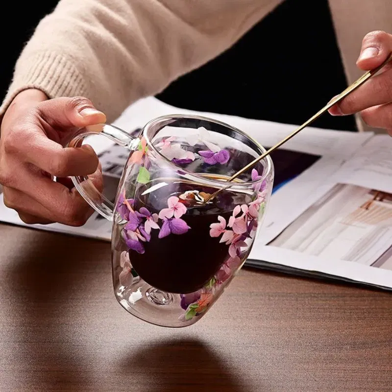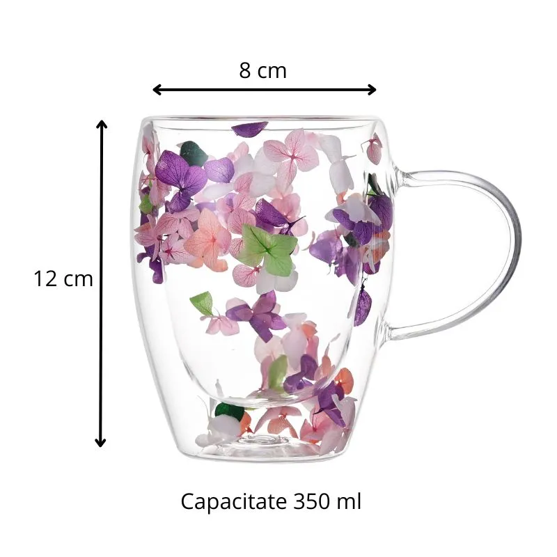 Aceasta cana Flower Blossom, cu pereti dubli, este creata pentru cei care doresc sa aduca un strop de frumusete si eleganta in rutina zilnica. Fabricata din sticla de inalta calitate, aceasta cana are un design transparent decorat cu flori colorate, oferind un efect vizual incantator. Cu o capacitate de 300 ml, este ideala pentru a savura orice bautura, de la ceai si cafea la sucuri si infuzii.